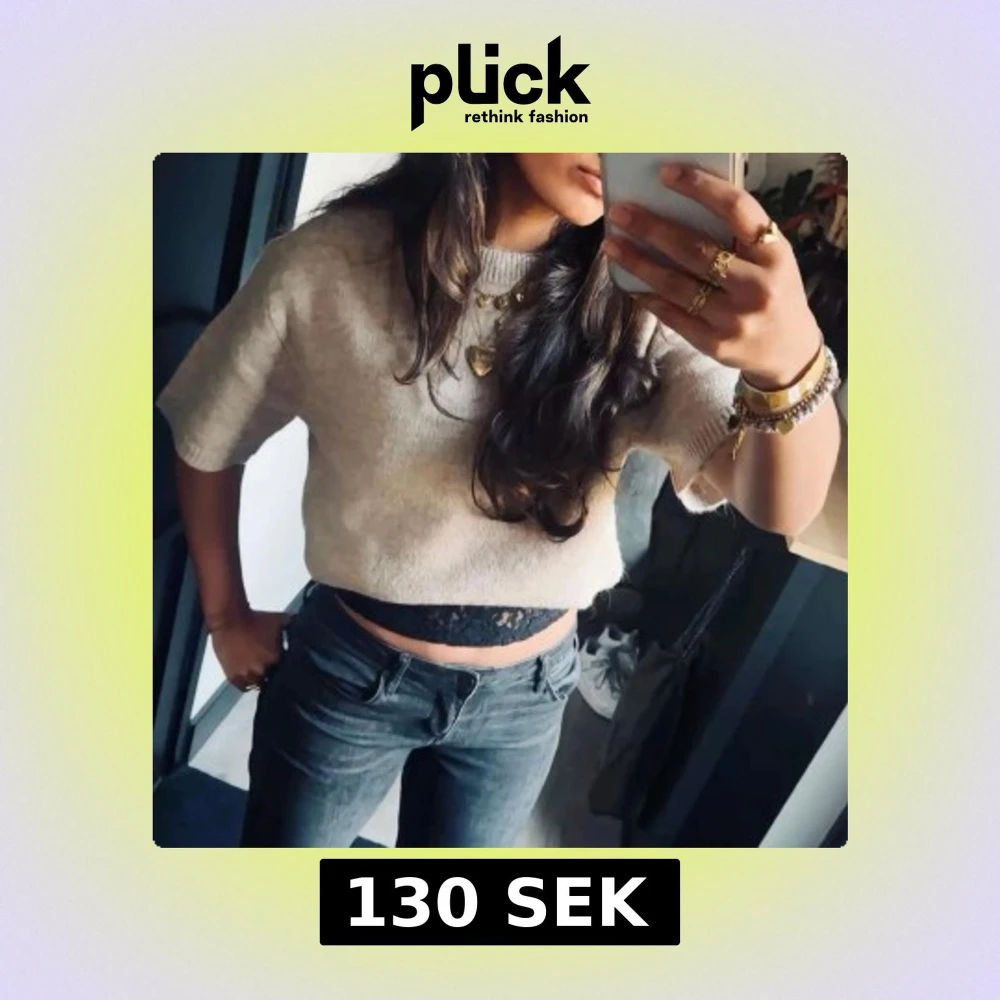 Superfin croppad stickad tröja från Kappahl i beige. Tröjan har korta ärmar, rund halsringning och ribbade detaljer vid ärmslut och nederkant. Str 146-152.