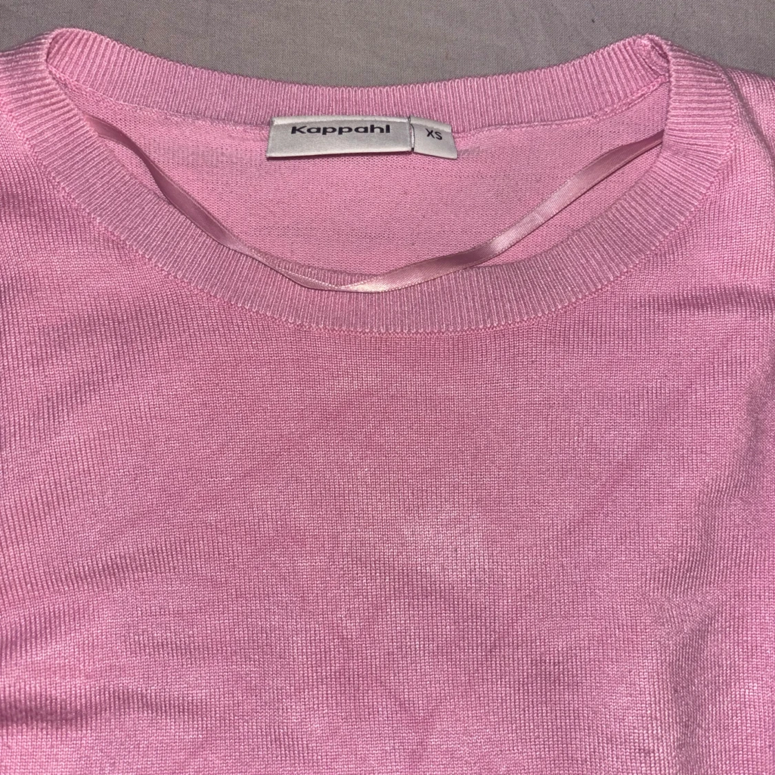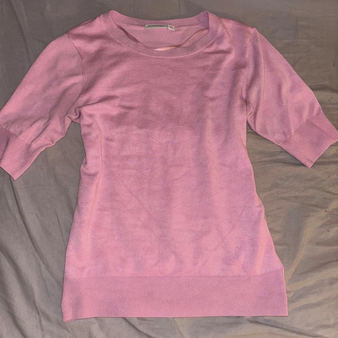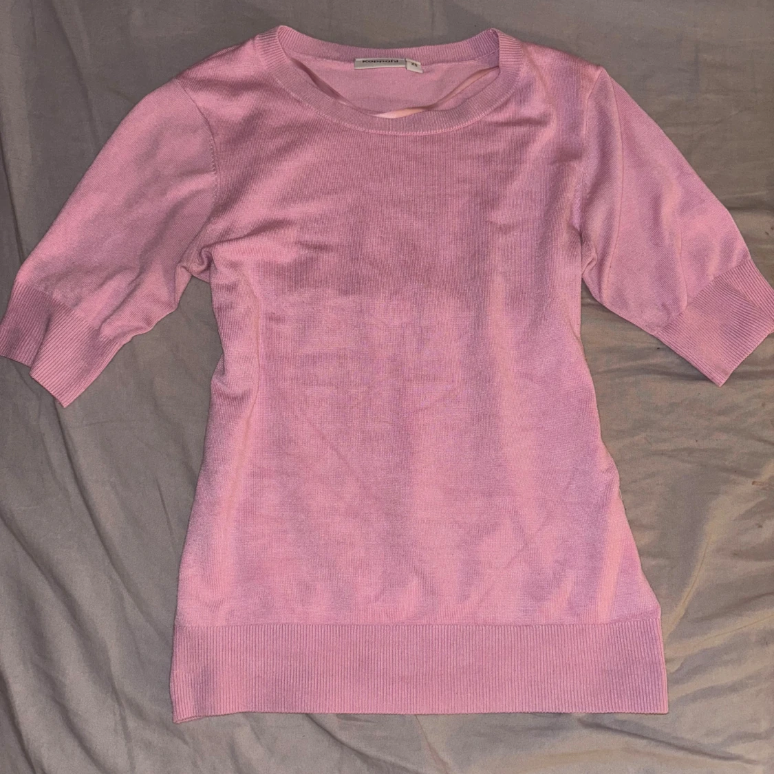Supersöt ljusrosa stickad tröja från Kappahl med rund halsringning och halvlånga ärmar. Tröjan har ribbade muddar vid ärmslut och nederkant, vilket ger en snygg och enkel look. Perfekt för dig som gillar en feminin och stilren vibe.