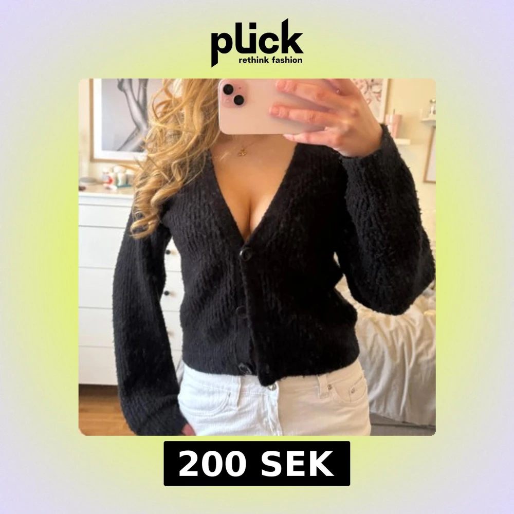 Säljer en svart stickad kofta med v-ringning och knäppning framtill. Koftan har lång ärm och är lite croppad i modellen, perfekt att styla till både jeans och kjol. Enkel och stilren design.