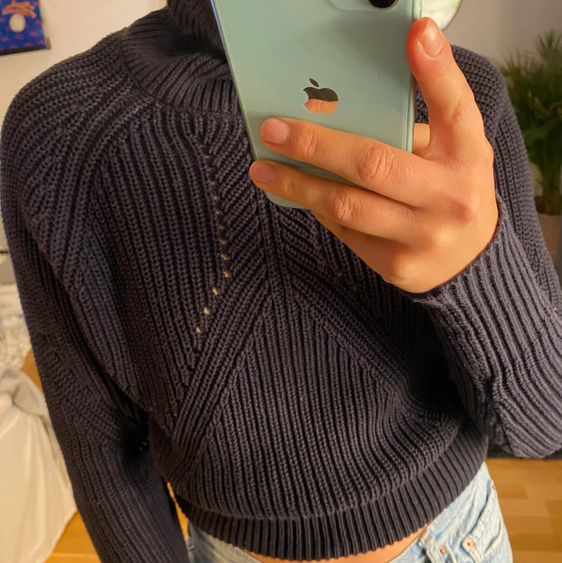 Mörk stickad tröja med fint mönster på!! Sitter fint på!