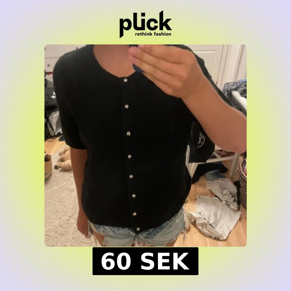 Svart kofta med korta ärmar och rund halsringning. Stängs med snygga pärlknappar framtill. Perfekt att slänga över en topp eller klänning för en chill men ändå stilren look. Det är storlek L men jag har S/M vanligtvis och jag tycker den sitter perfekt på mig!🩷