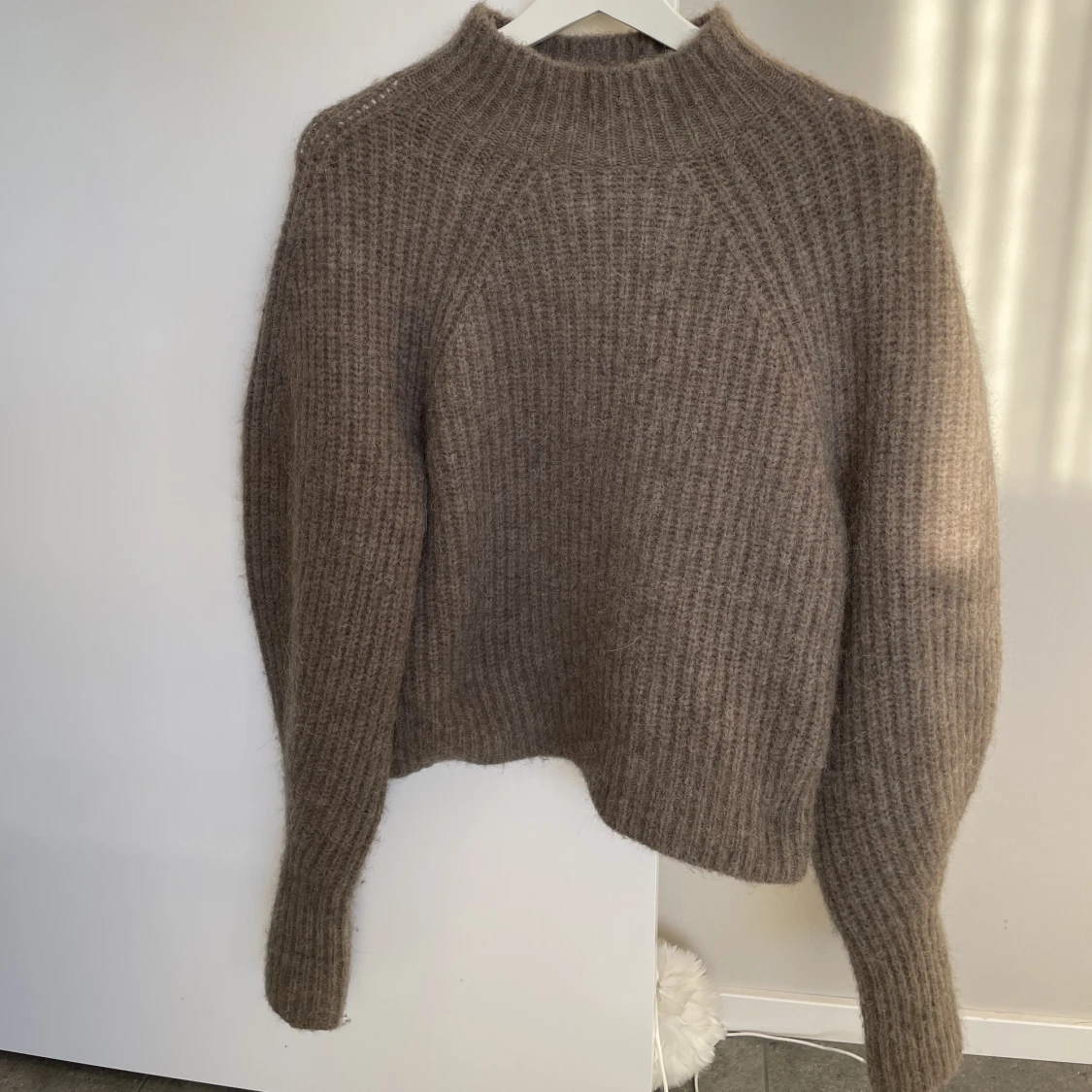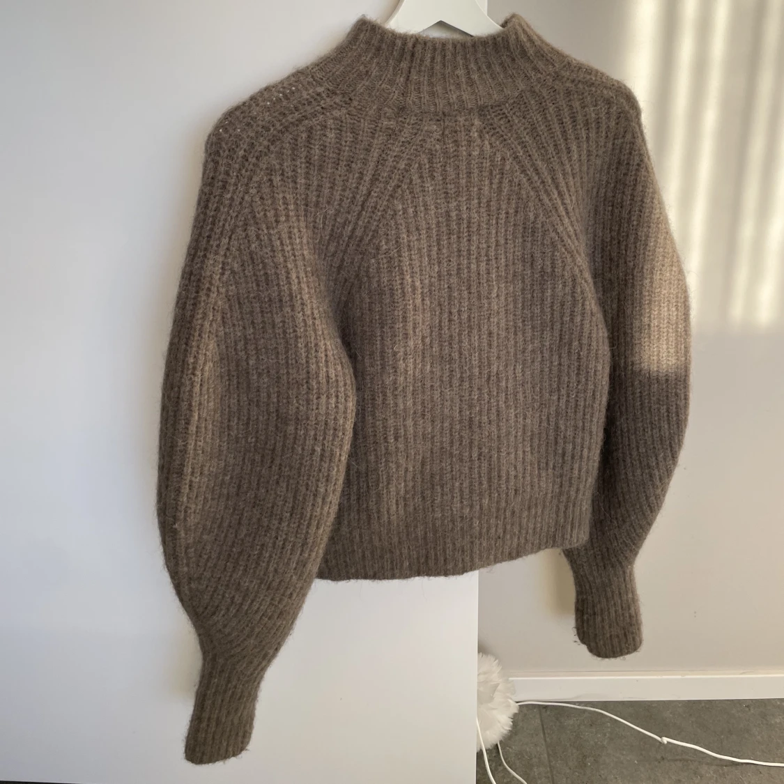 Jätte fin stickad tröja med hög krage och ”ballong ärmar”. Funkar utmärkt vid både finare tillfällen och som mysig varm tröja. Tröjans material är delvis alpaca, delvis ull och delvis polyester. Storlek XS. Färgen är en fin kall brun.