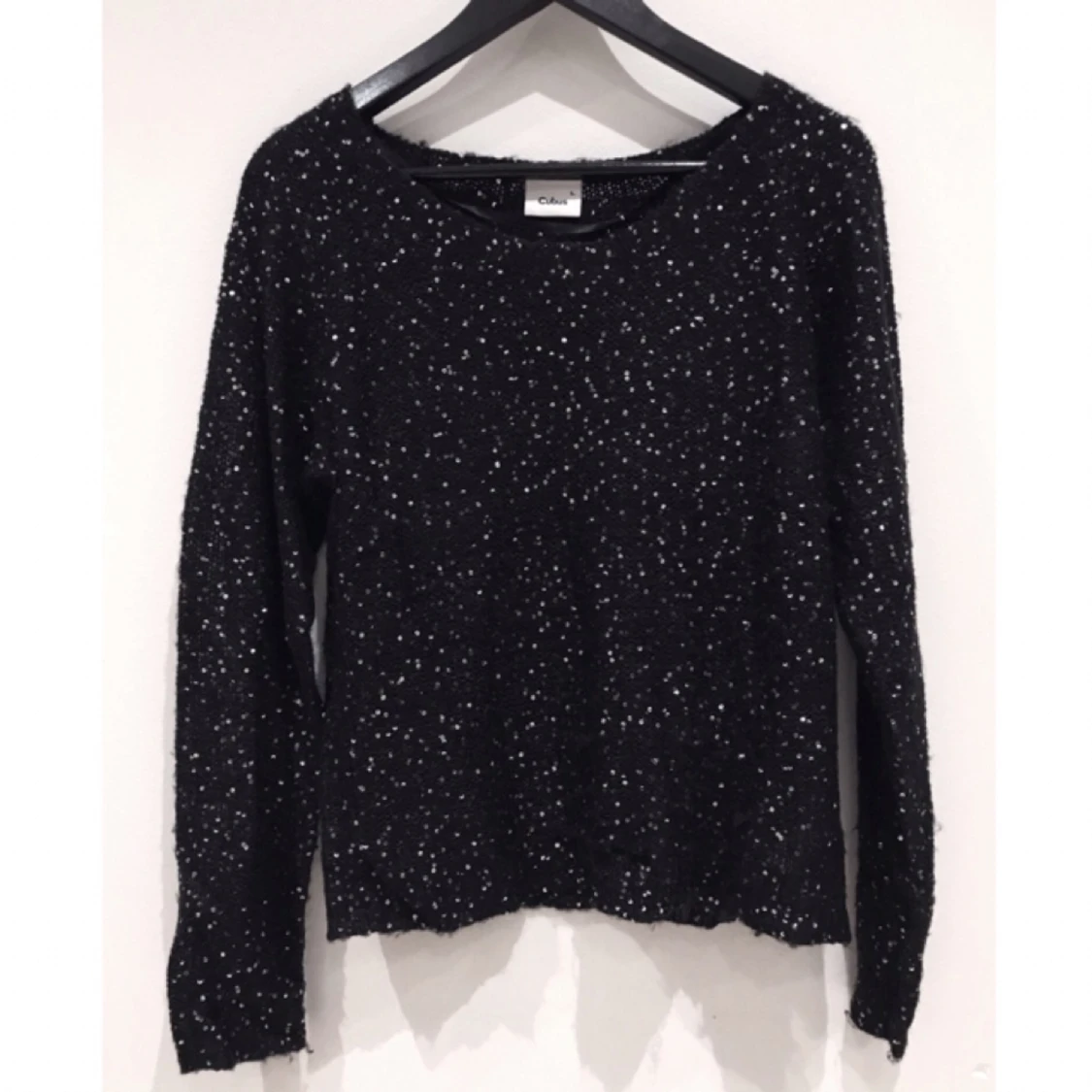 Stickad tröja med fastsydda paljetter över hela tröjan. Storleken är L men jag har använt den som oversize modell i S/M. Kan skicka fler bilder/info om så önskas!