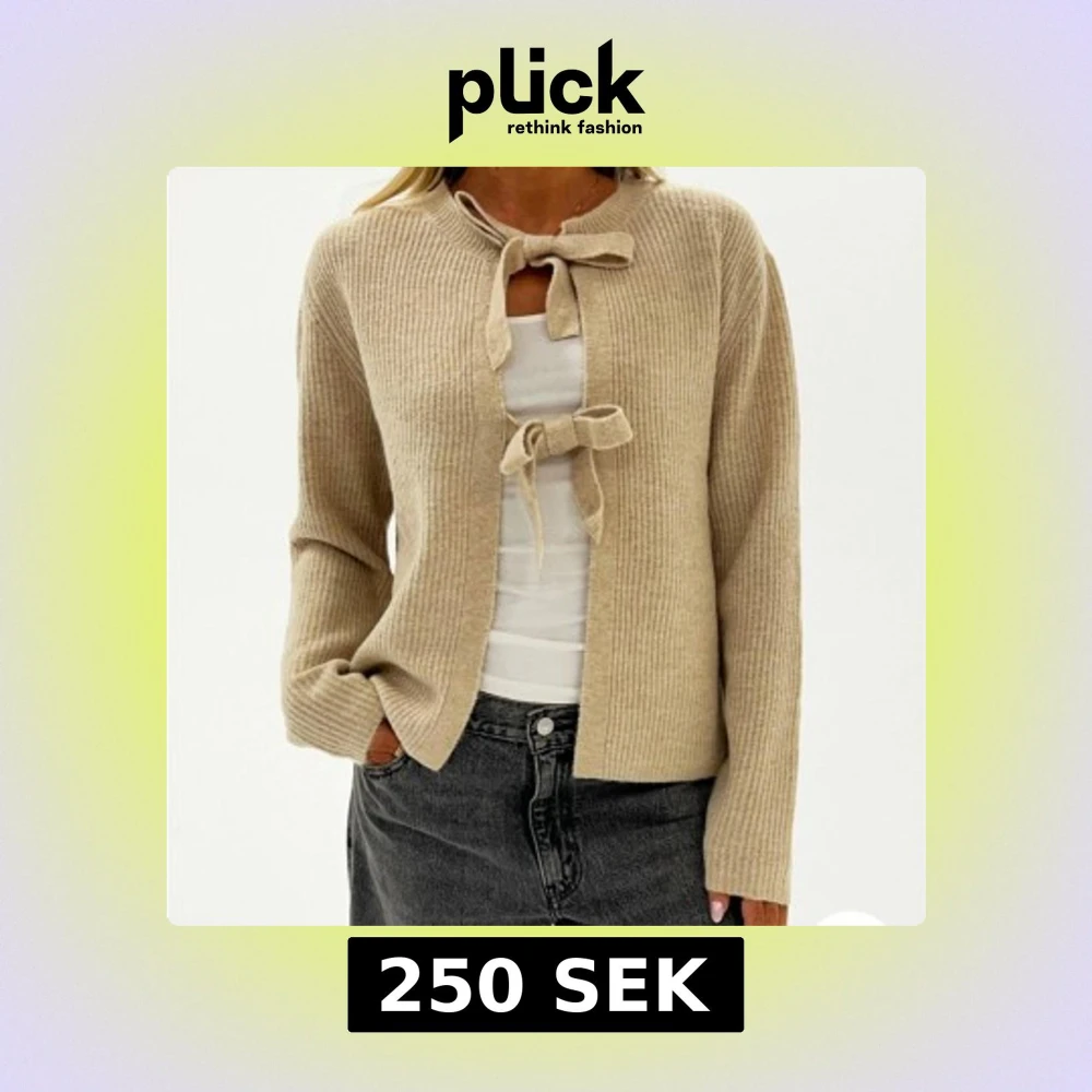 Beige stickad kofta med söta knytningar från Nelly. Aldrig använd men lappen är borttagen. Väldigt liten i strl sitter som S/M inte L. Slutsåld på hemsidan. Nypris 400