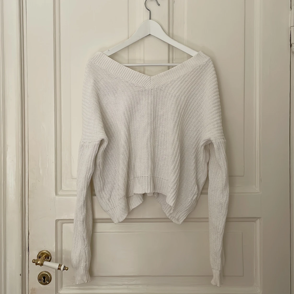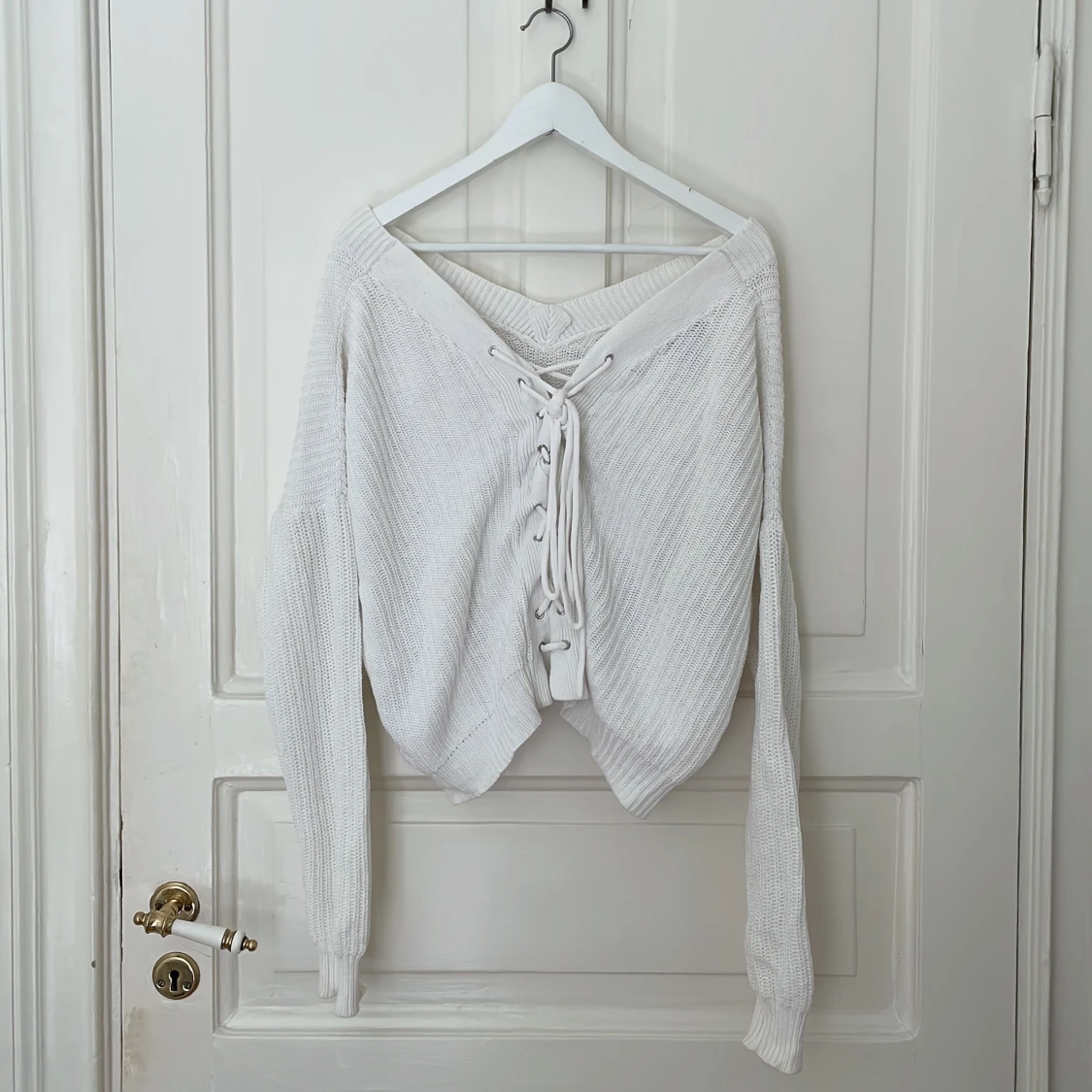 Det är en vit stickad kofta med snörad rygg från Nelly i storlek S. Jag köpte den vid 2016/17 för ca men har inte använt den efter 2018. Den är lite oversized och är tänkt att hänga över ena axeln. Super gullig verkligen men är inte min stil längre 💗