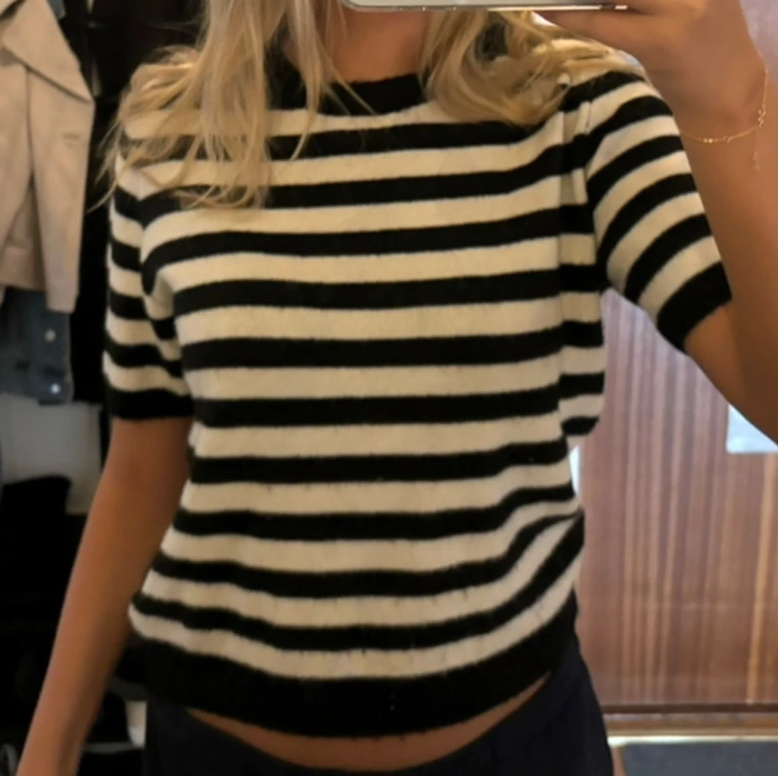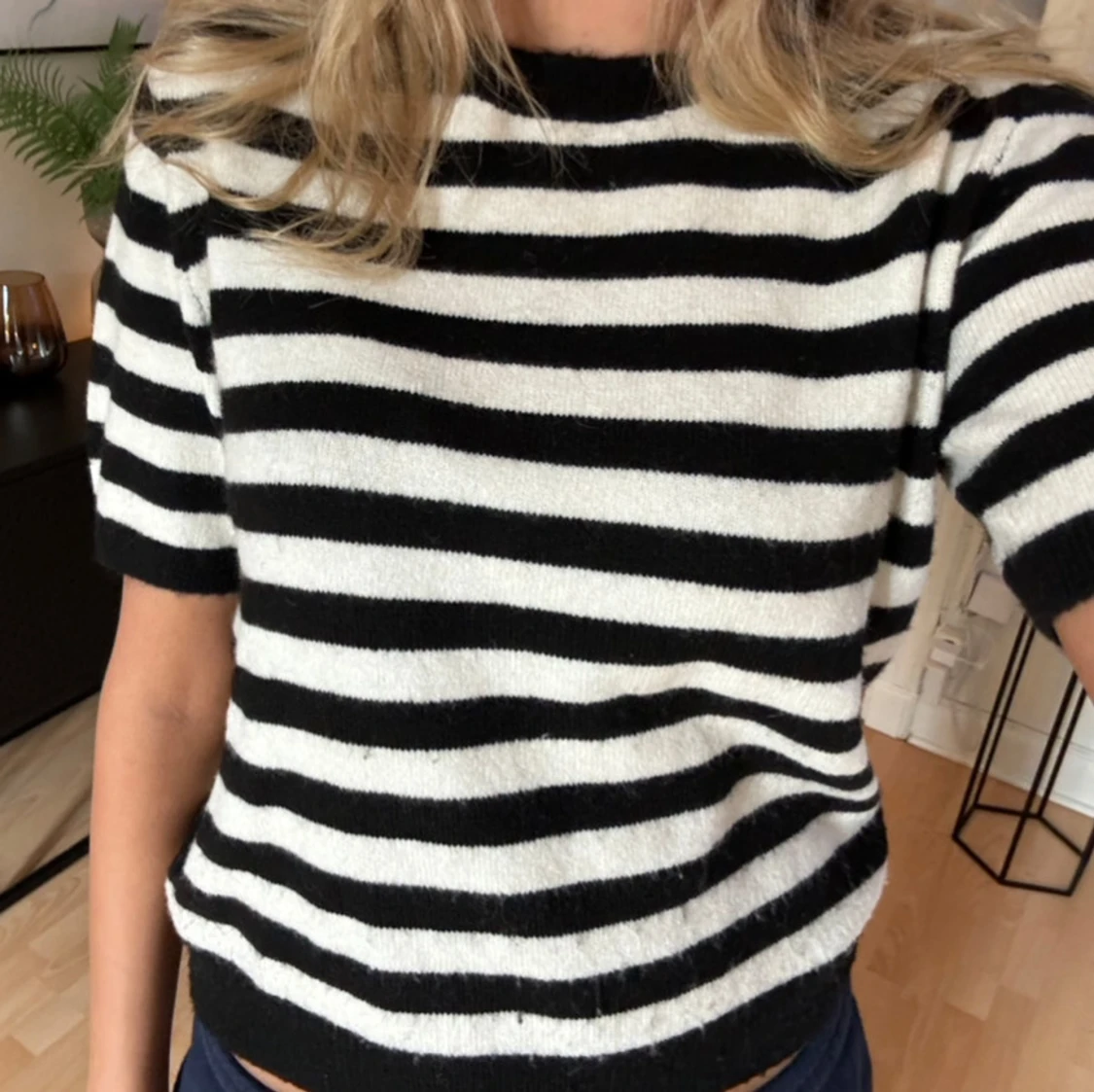 Säljer denna kortärmade stickade tröja i storlek M, svart och vit randig🖤🖤⚡️⚡️😁😁✌🏻✌🏻