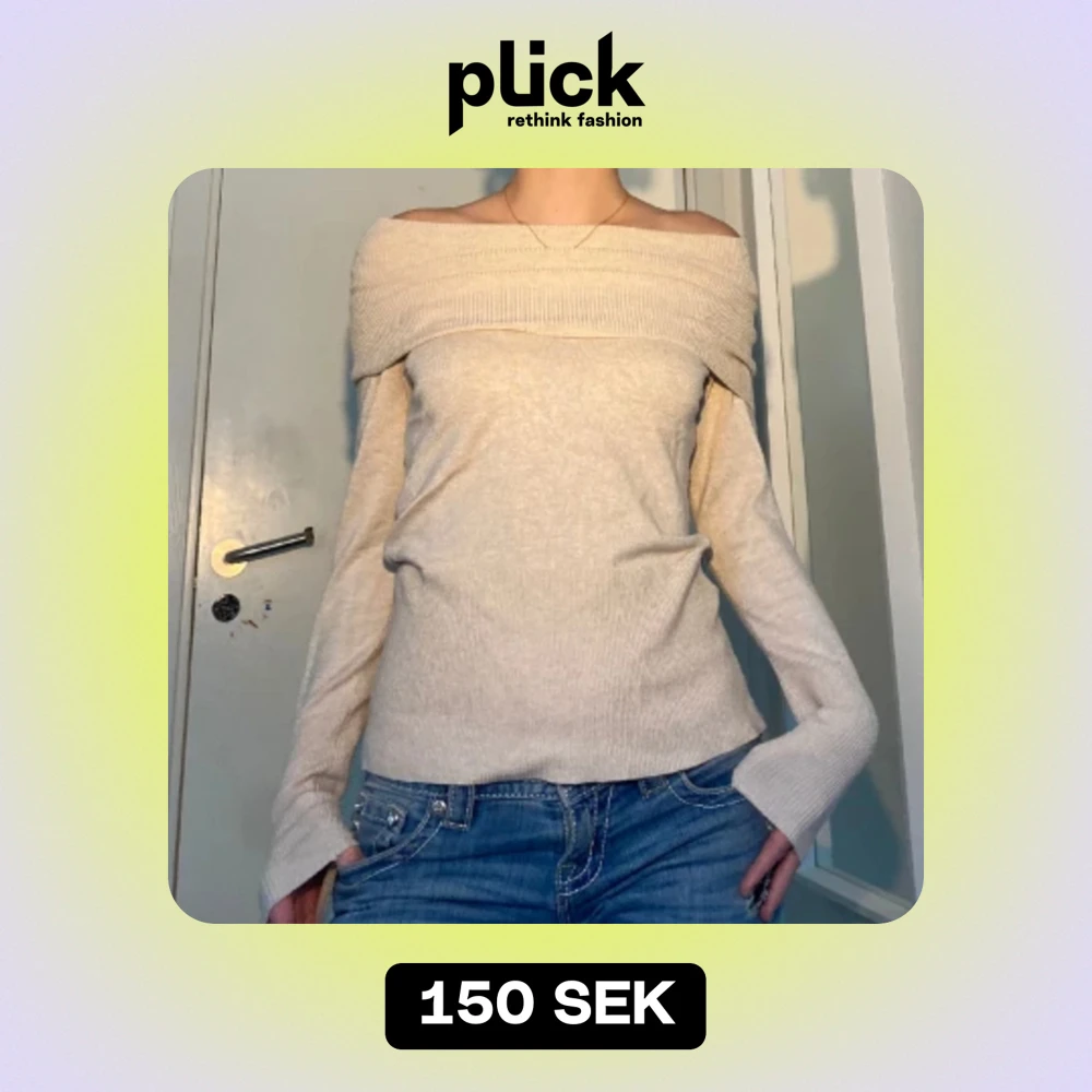 Stickad off-shoulder. Sömmen har gått upp på två ställer under kragen (se bild 3). Inget som syns då defekten som sagt täcks av kragen