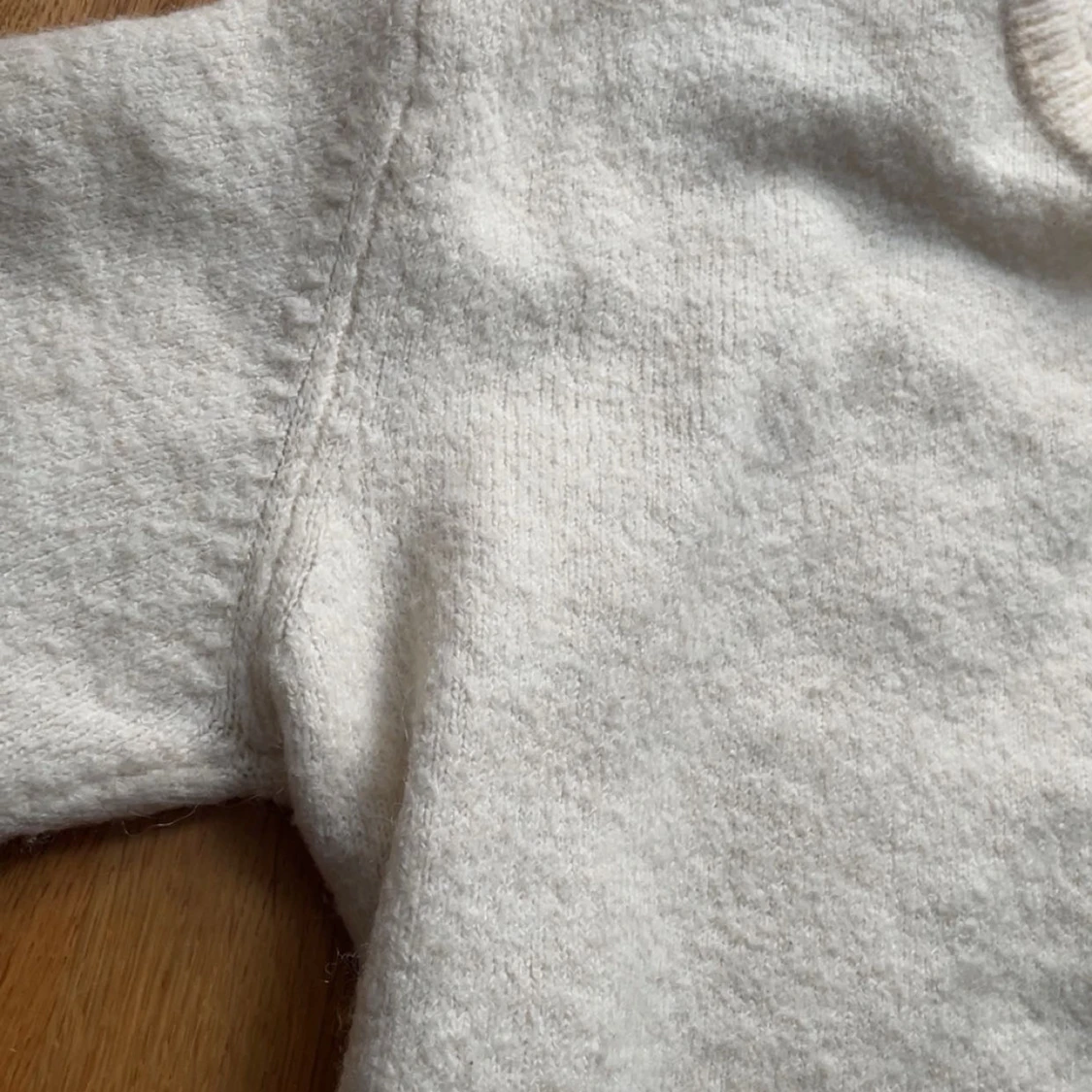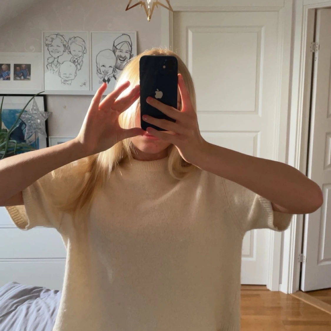 Superfin kortärmad stickad tröja i en krämvit och mjuk färg.Lite boxig/overzised passform och lite croppad i modellen (eller så är den bara lite för liten på mig). Passar perfekt till lpgmidjade jeans eller en fin kjol! Den har inga fläckar eller hål och säljs pgr av rensning! Storlek: S (passar även XS-M beroende på önskad passform). Skriv om fler närbilder! 🌸☀️🥰