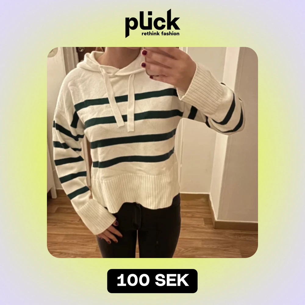 Säljer en kroppad vit stickad tröja i storlek XS med gröna streckmönster och luva på baksidan. Den är både trendig och bekväm, perfekt för en stilren och avslappnad look. Tröjan är i bra skick och klar för en ny ägare.