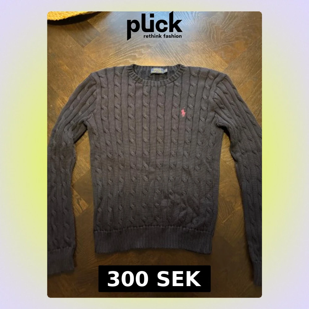 Snygg mörkblå stickad tröja från Polo Ralph Lauren med klassiskt kabelstickat mönster och rund hals. Tröjan har lång ärm och en liten röd broderad logga på bröstet. Perfekt för dig som gillar stilrena och tidlösa plagg.