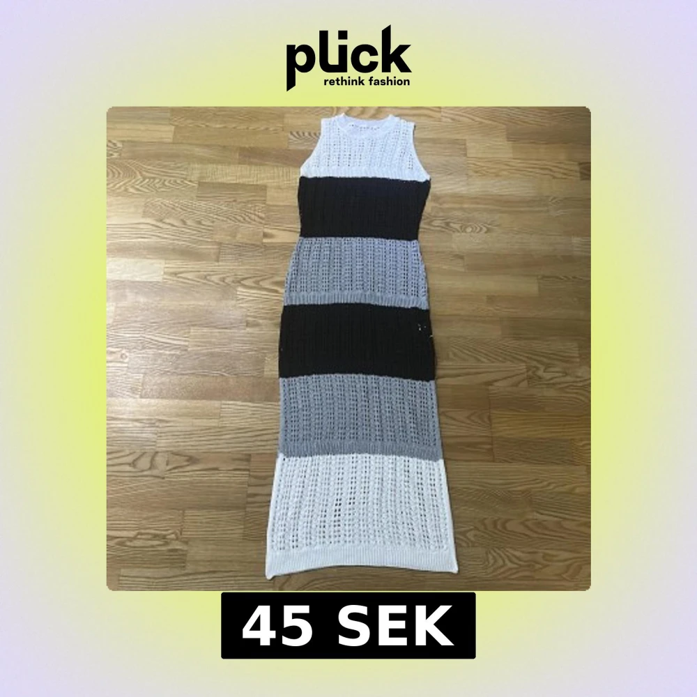 Snygg stickad långklänning med breda blockränder i svart, grått och vitt. Ärmlös modell med rund hals och genombruten stickning som ger en luftig känsla. Perfekt för dig som gillar en chill och trendig look.