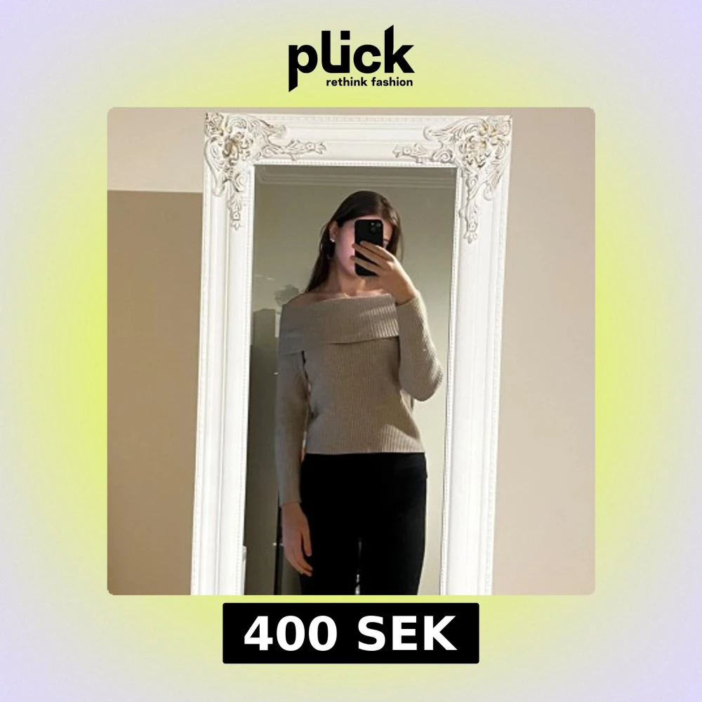 Säljer en beige stickad tröja med ribbad struktur och bred offshoulder-krage. Tröjan har lång ärm och sitter snyggt med en lite kortare passform. Perfekt för dig som gillar stilrena och trendiga plagg med en twist.