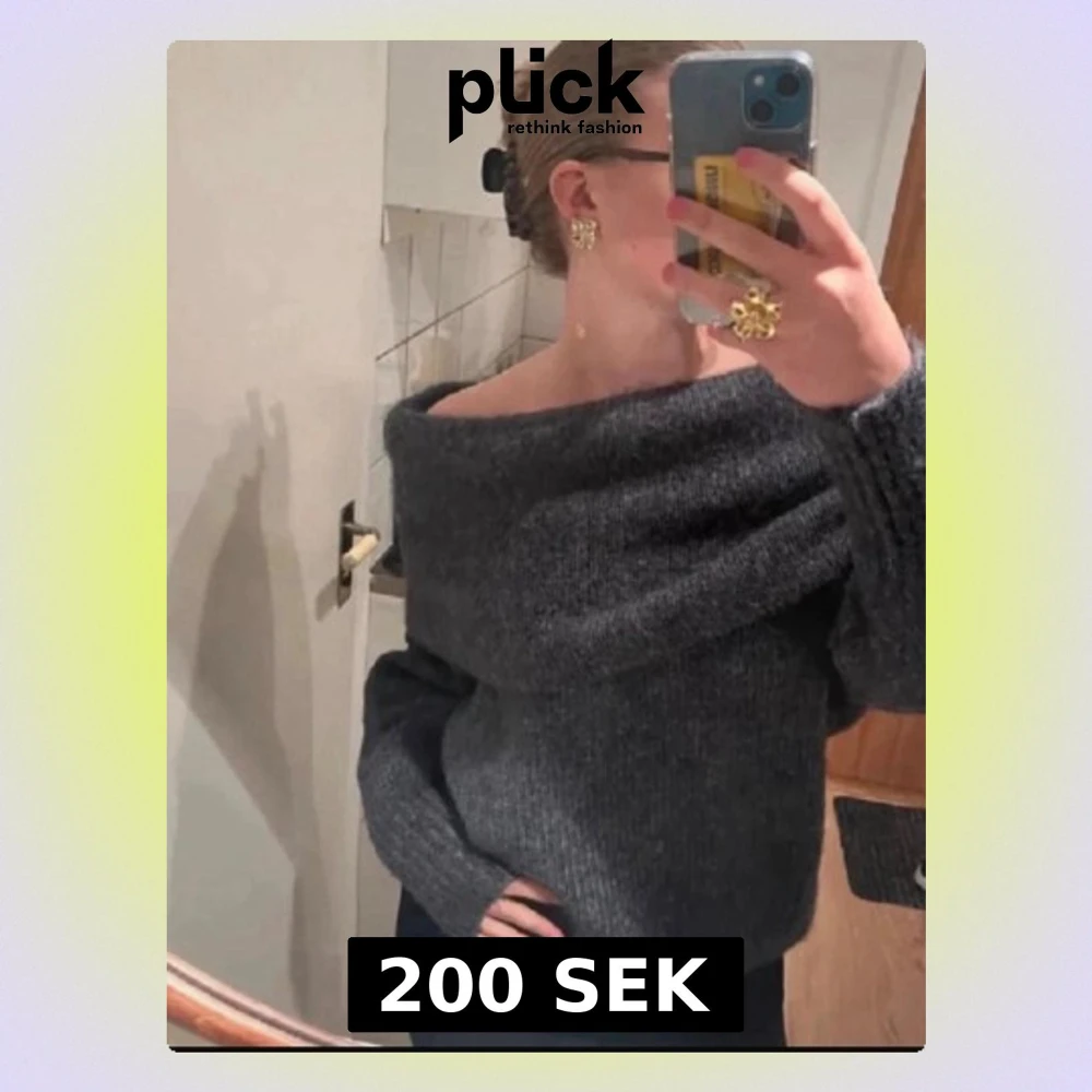 Mysig mörkgrå stickad tröja med bred off shoulder-krage och långa ärmar. Tröjan har en avslappnad passform och ribbstickade muddar. Perfekt för lager-på-lager och en chill look.