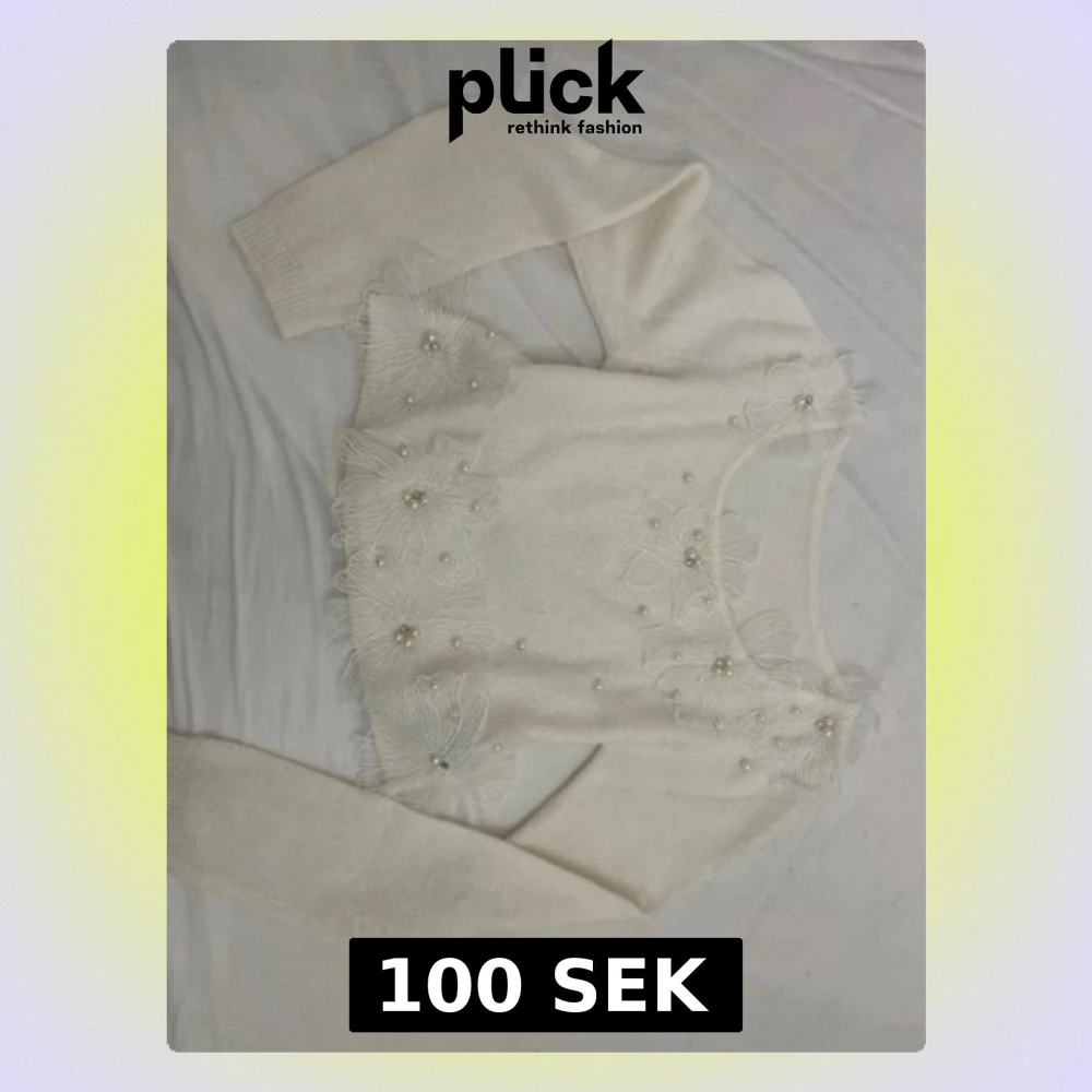 Vit stickad tröja med pärlor och blommor