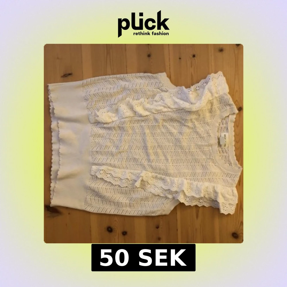 Supersöt vit blus från Holly & Whyte med spetsvolanger längs axlarna och ett stickat hålmönster i zigzag. Blusen är ärmlös och har rund halsringning med ribbad kant. Perfekt för dig som gillar romantiska detaljer och ljusa toner.