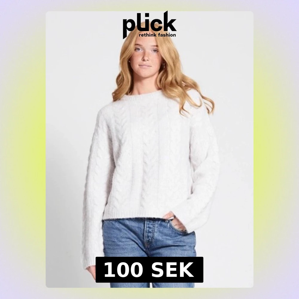 Säljer en vit stickad tröja med klassiskt kabelstickat mönster. Tröjan har en avslappnad passform och långa ärmar. Den sitter längre ner, än va bilden visar