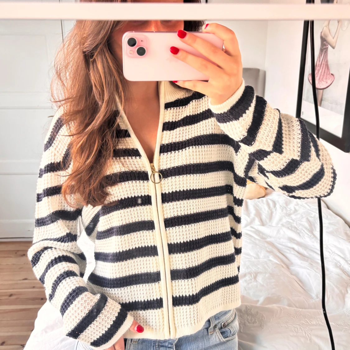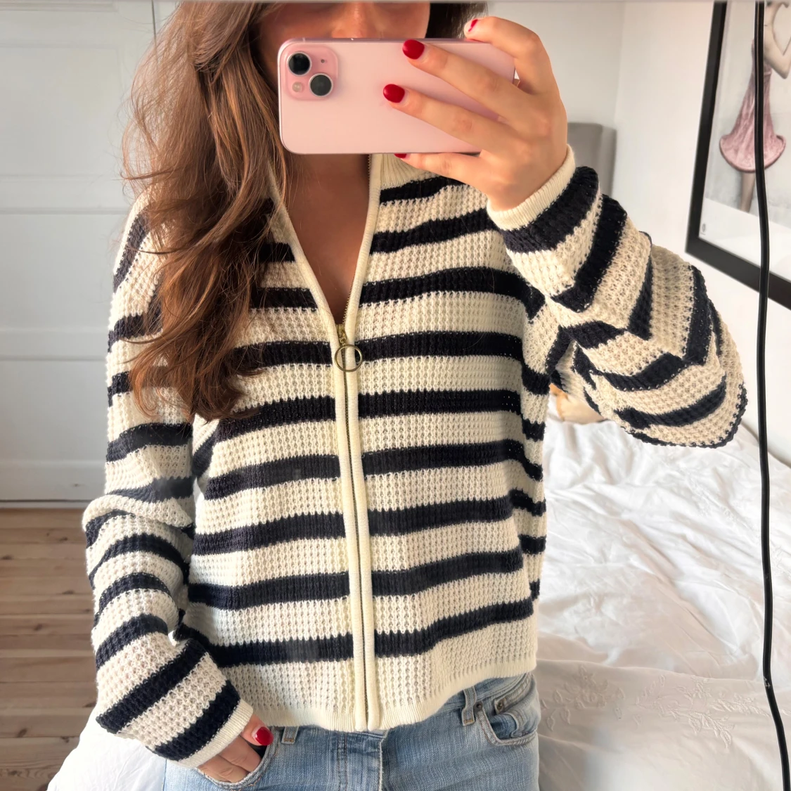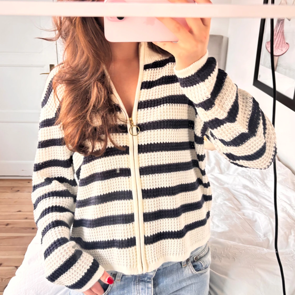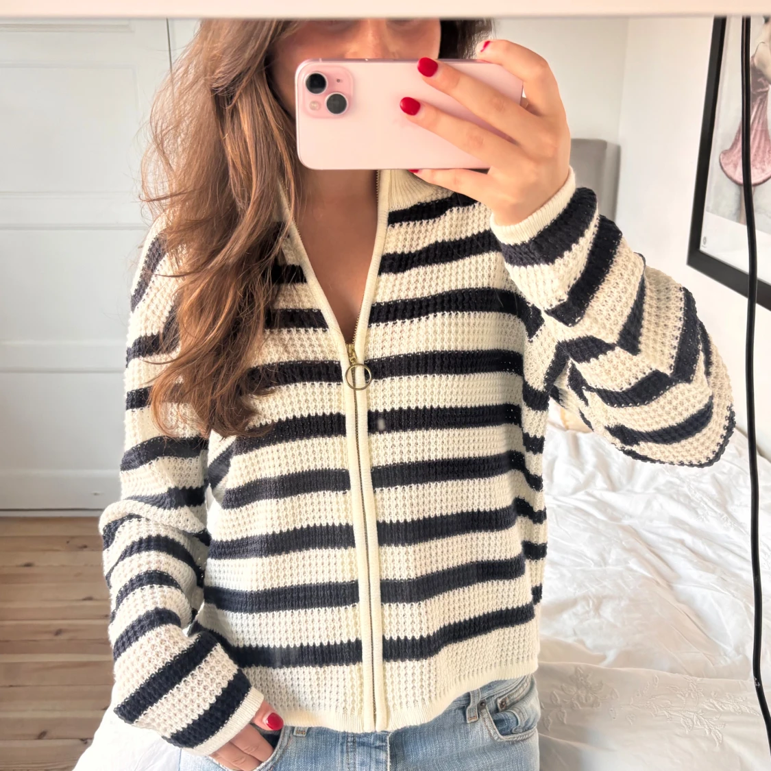 Snygg randig kofta med dragkedja! Lite oklart den är svart eller mörk marinblå