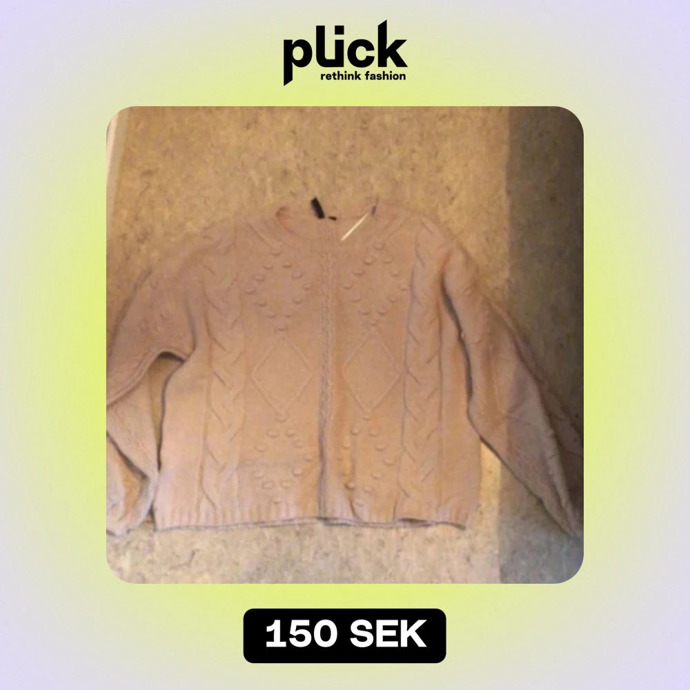 Säljer en supermysig beige stickad tröja med ett snyggt flätmönster och små bollar som detaljer. Perfekt för kyliga dagar och passar till allt! Tröjan har långa ärmar och en bekväm passform.