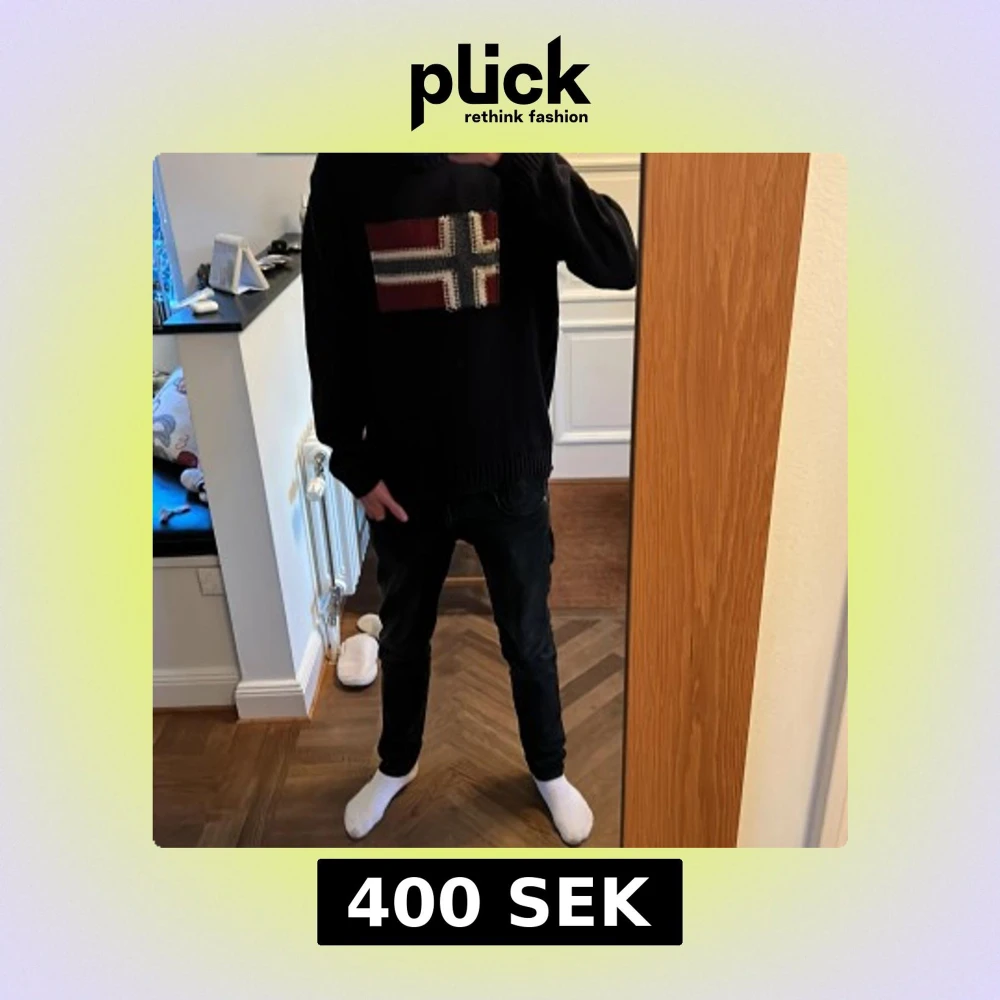 Säljer en snygg mörkblå stickad tröja från Napapijri med en stor norsk flagga på bröstet. Tröjan har långa ärmar och en ribbad krage. Perfekt för kyliga dagar! Lite stor för mig så fick inte så stor användning!