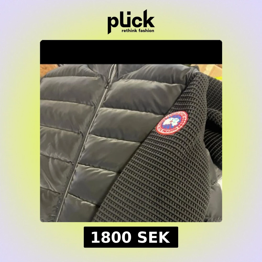 Snygg svart dunjacka med stickade ärmar och ett runt märke på ärmen. Jackan har en dragkedja framtill och quiltad design som ger en modern look. Perfekt för kyligare dagar. det finns många storlek av denna jag kan priset kan diskuteras