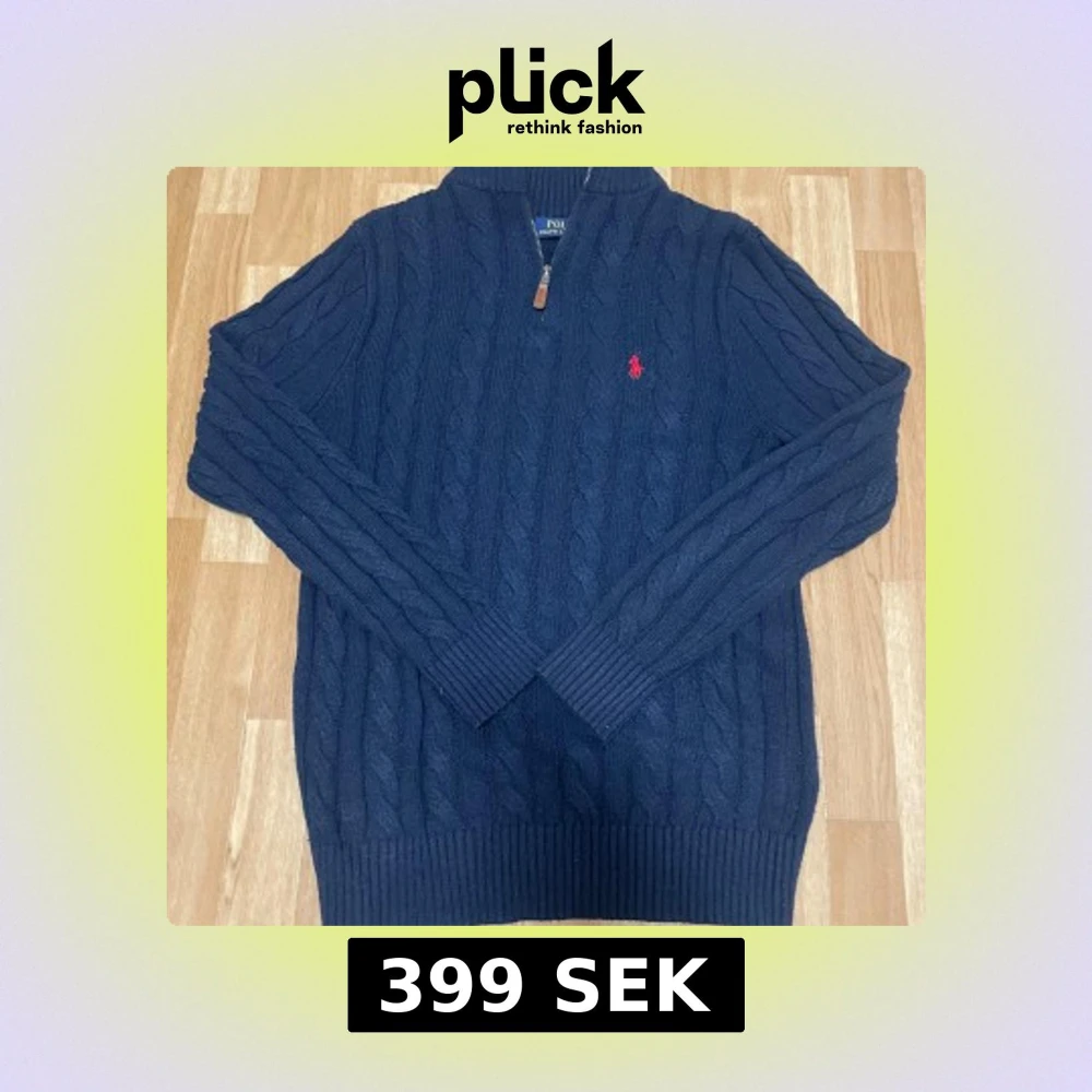 Klassisk och stilren mörkblå kabelstickad tröja läderdetalj på dragkedjan. Röd broderad logga på bröstet. Perfekt både till vardags och lite mer uppklätt. Skick: Mycket bra begagnat skick – inga fläckar eller hål, endast lite normalt ludd. Storlek: (L.) Passform: Regular fit Färg: Mörkblå (navy) Superfin kvalitetsstickad tröja som håller länge.