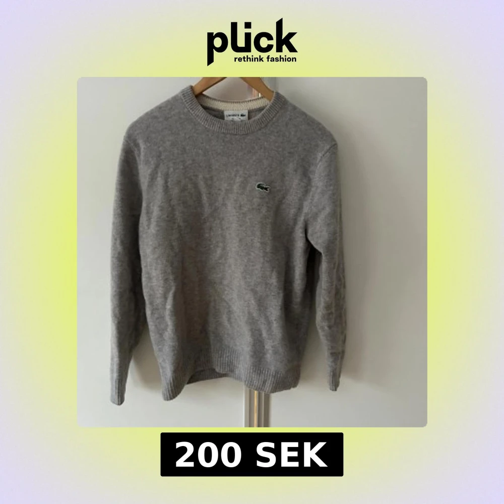 Snygg grå stickad tröja från Lacoste med klassisk rund hals och den ikoniska gröna krokodilen broderad på bröstet. Tröjan har ribbade muddar vid ärmslut och nederkant, och är långärmad. Tröjans storlek är L men jag skulle säga att den är en medium