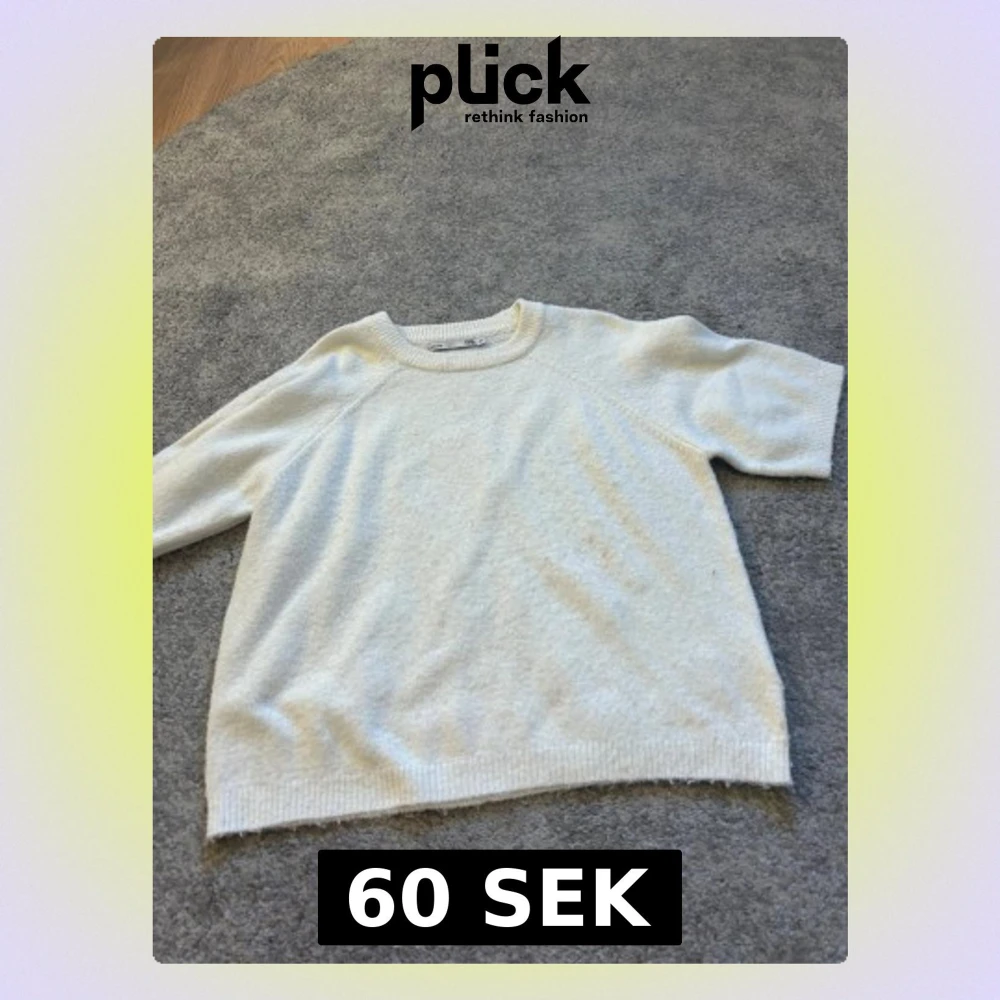 Vit stickad tröja från 157 med rund halsringning och korta ärmar. Tröjan har ribbstickade muddar vid hals, ärmslut och nederkant. Enkel och stilren design som passar till många olika outfits.