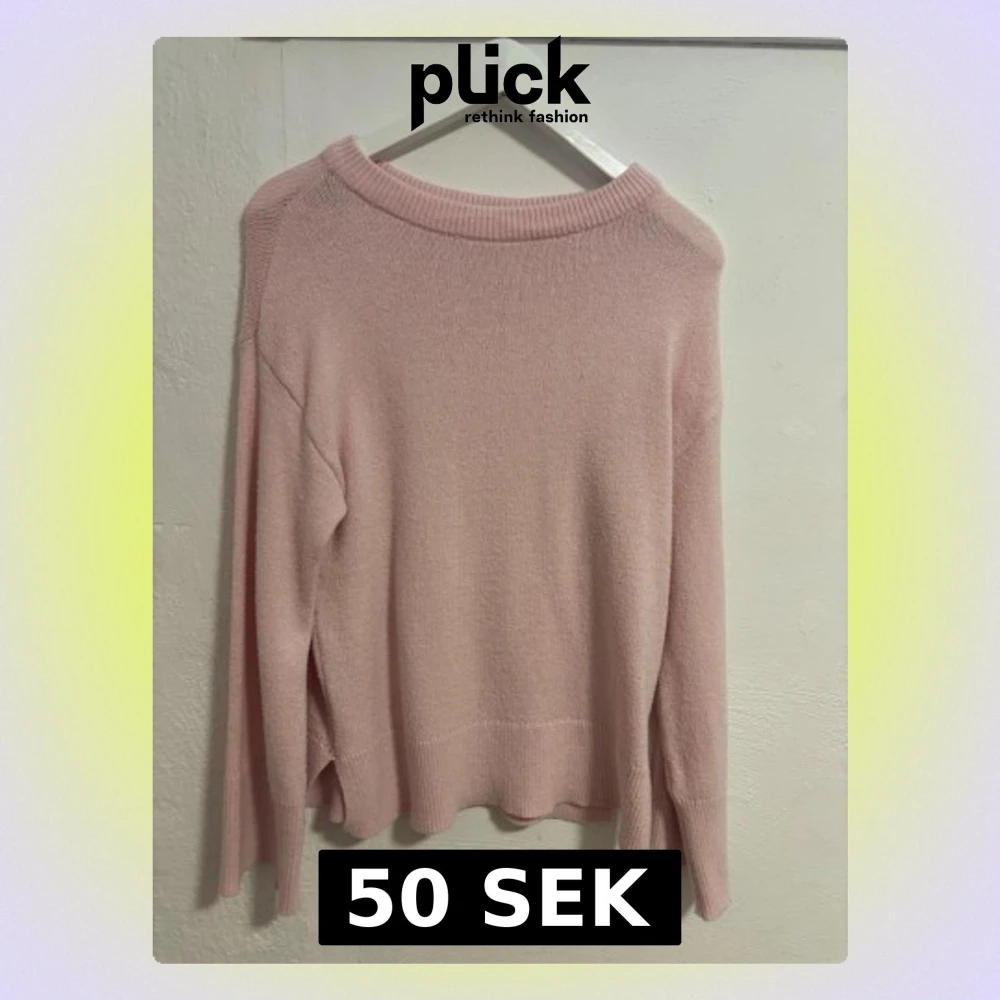 Supersöt ljusrosa stickad tröja från 157 i storlek XS. Tröjan har lång ärm, ribbade muddar och en liten slits på slutet av tröjan för extra detalj. Perfekt för lager på lager under höst och vinter.