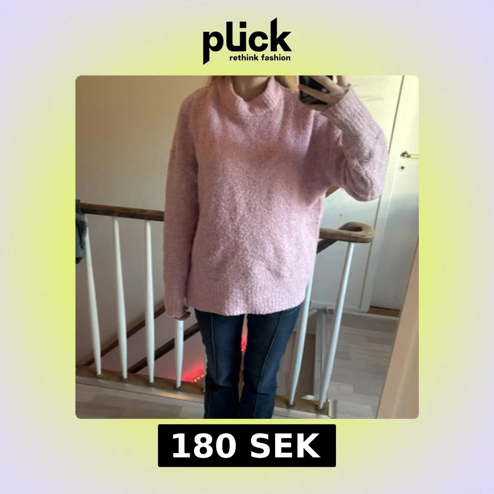 Mysig ljusrosa stickad tröja med lös och avslappnad passform. Tröjan har en högre krage och långa ärmar, perfekt för kyligare dagar. Den är supermjuk och passar perfekt till jeans eller leggings.