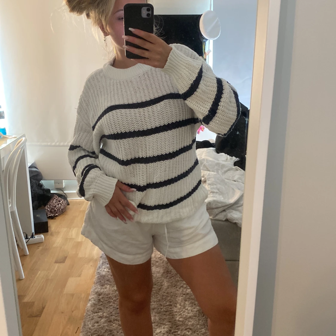 En stickad tröja som är vit med blåa ränder på. Super skön