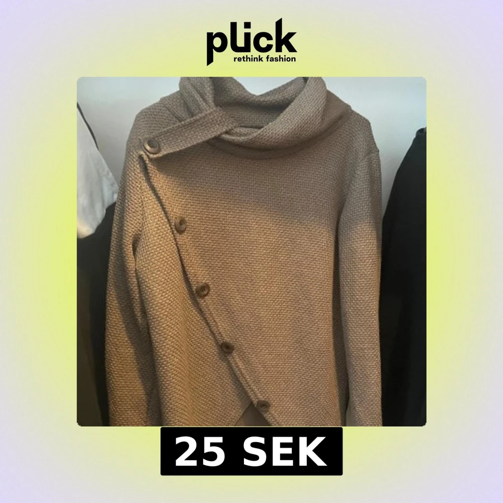 Säljer en beige stickad kofta i storlek XL med unik omlottknäppning och stora knappar längs med. Koftan har långärmad design och en bred, mysig krage som ger extra stilpoäng. Perfekt för dig som gillar en chill och snygg look. Storlek XL. Mysig för både sommar och vinter.