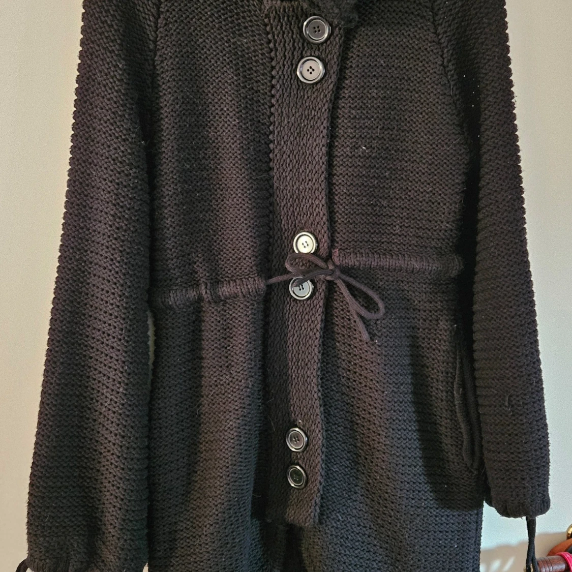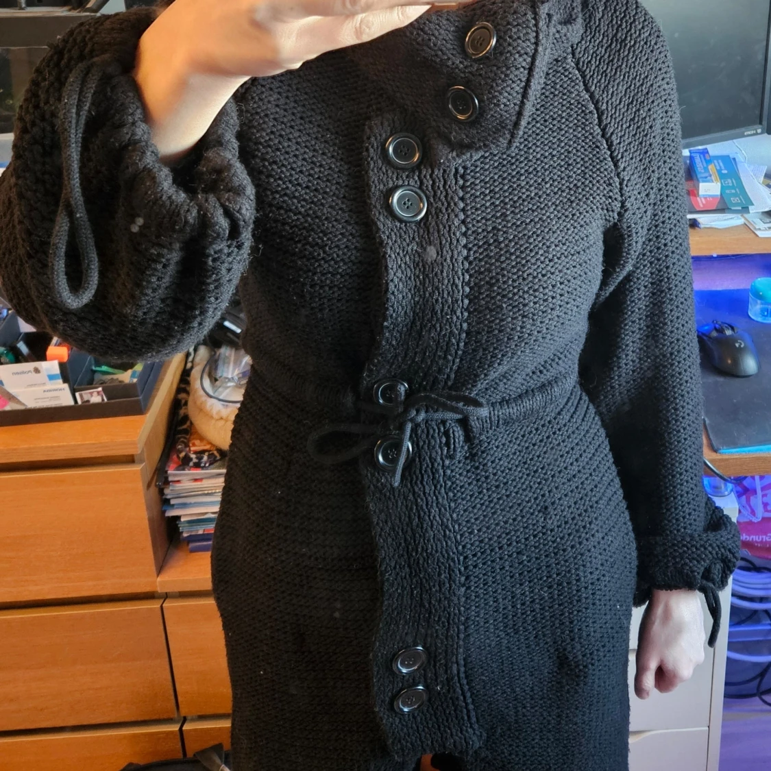 En superfin svart kofta från Sara Kelly, koftan har legat nedpackad så kommer att rolla av den innan ev försäljning. Den har både knappar, fickor och snörning . Kragen kan man ta bort då den sitter med knappar, såg en tråd(se sista bild) men kan lösa det med att fixa så den kommer på insidan. Som sagt den har legat nedpackad och bilderna gör sig inte riktigt men den är annars I nyskick förutom denna tråd som finns. Strl 38-40. Nypris 799 kr