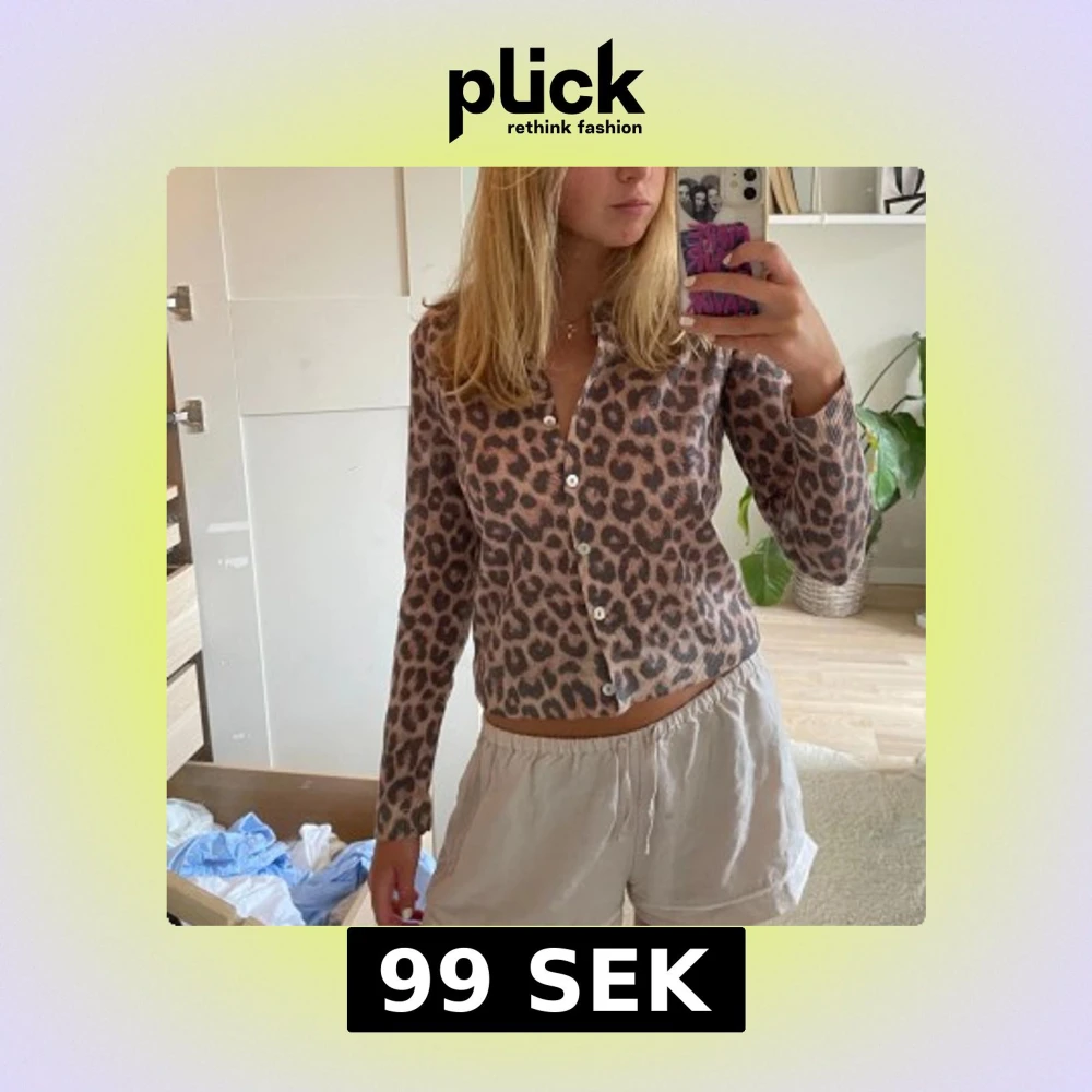 Säljer en snygg leopardmönstrad kofta med långa ärmar och vita knappar framtill. Koftan är i beige och bruna toner, har en croppad passform och är tillverkad i ett mjukt stickat material. Perfekt för dig som vill sticka ut lite extra.