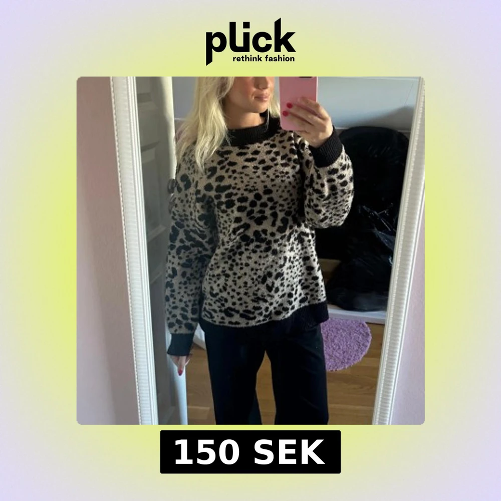 Säljer en beige stickad tröja med svart leopardmönster💓lite osäker på storlek tror det är en m, men passar mig som vanligtvis har xs-s.