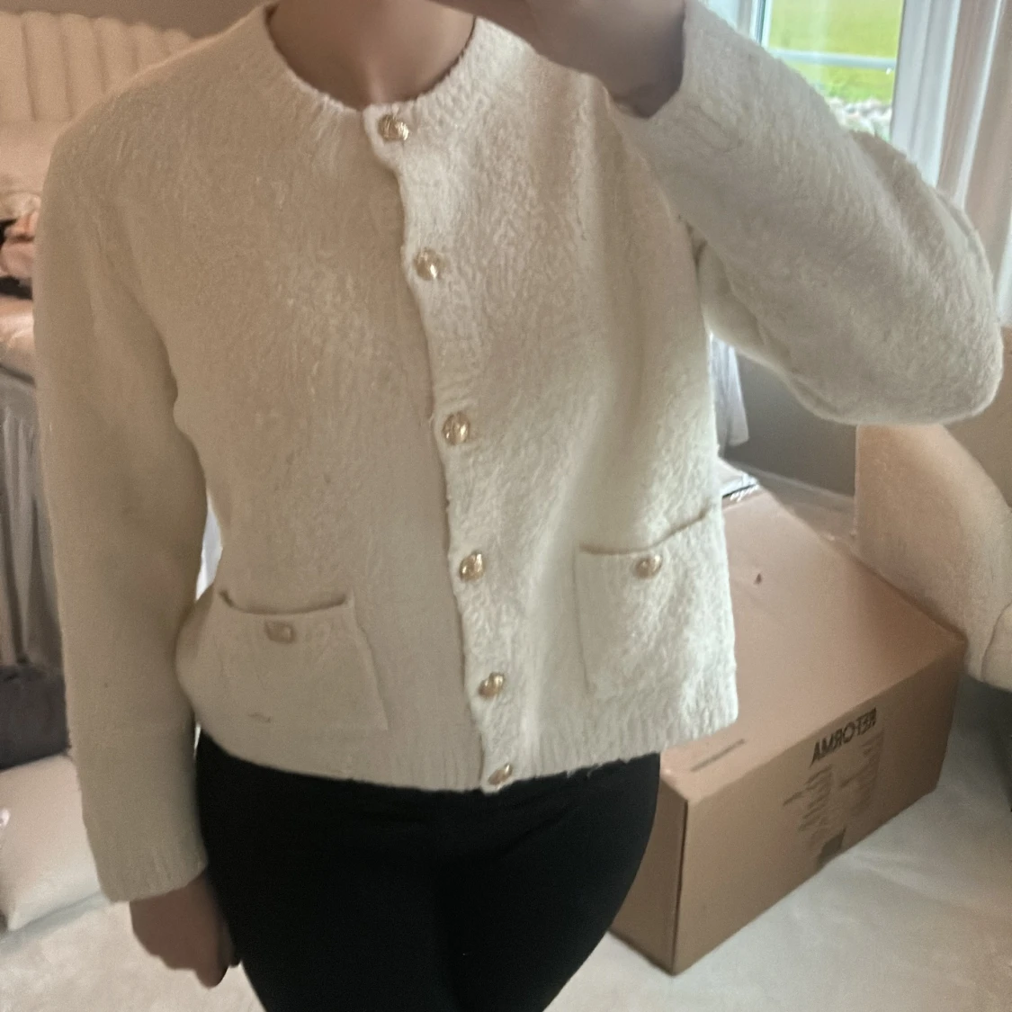 Supersöt stickad kofta med guldknappar. Den är i ett fint skick i storlek L men passar mig som alltid bär S. Nypris 599kr. Skriv vid frågor. Pris går att diskutera💗