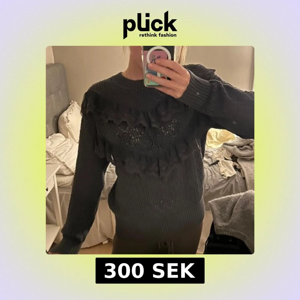 Mysig grå stickad tröja från Lindex med lång ärm och snygga volangdetaljer i spets över bröstet. Tröjan har ett hålmönster och ribbade muddar vid hals, ärmslut och nederkant. Perfekt för dig som gillar en söt och trendig look.💞💞stl 164 men skulle säga att den är som en xs/s