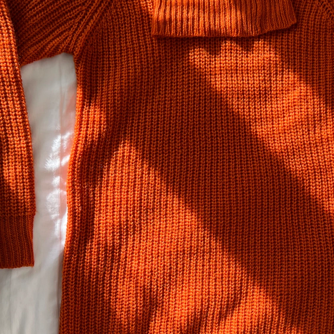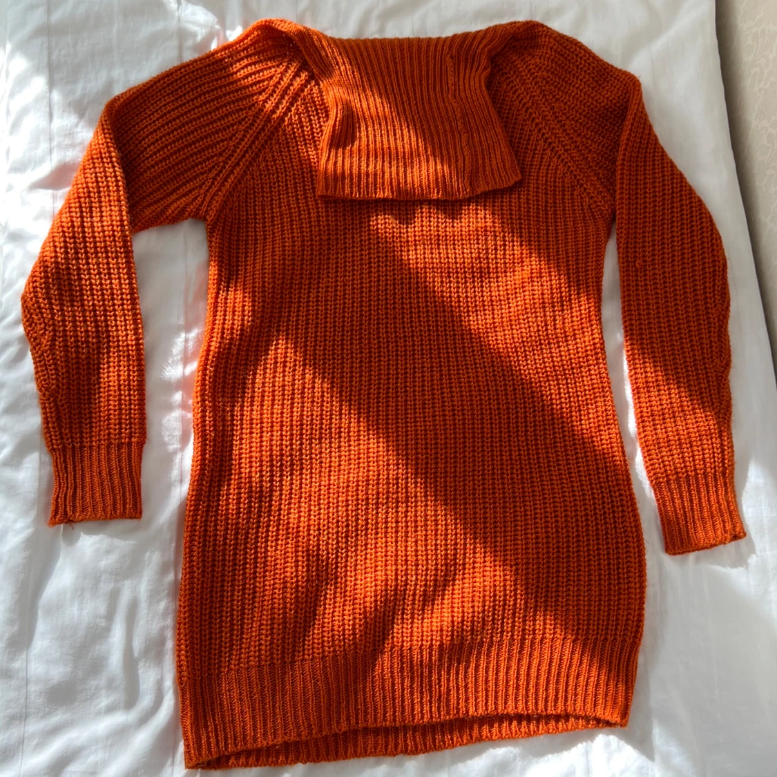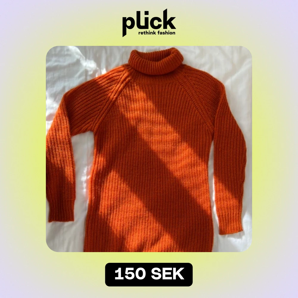 En vacker stickad tröja som är långärmad & längden är lång till låret. Kan stylas upp som en klänning för er som annars bär S eller med ett par vackra jeans. Lång polokrage som viks ner vid halsen. Använt den en eller två gånger max.