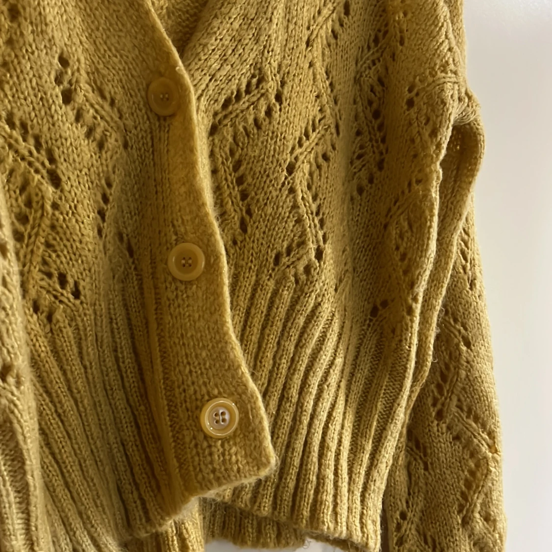 Gul stickad cardigan med mindre ballongärmar. Storlek L men passar även storlek XL.