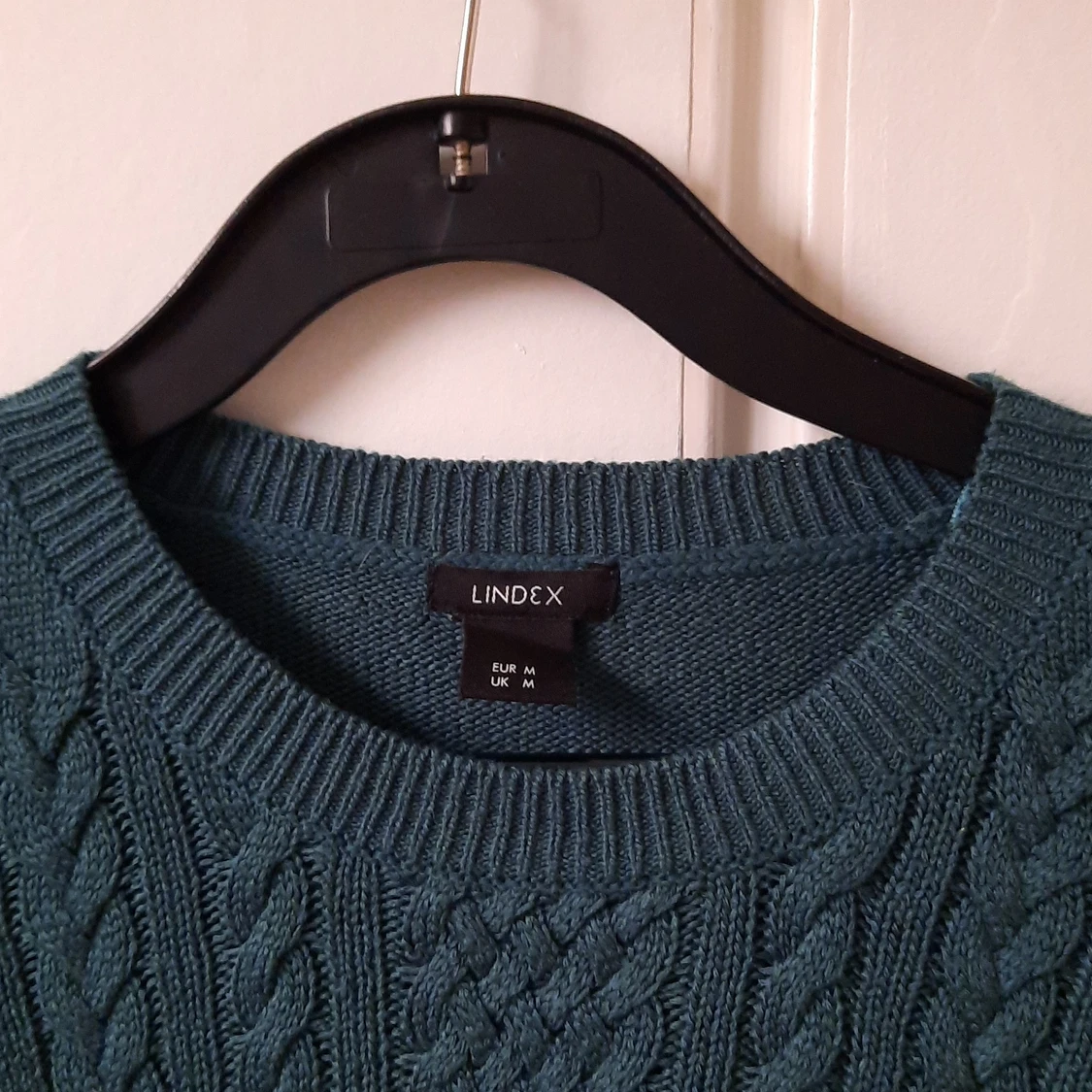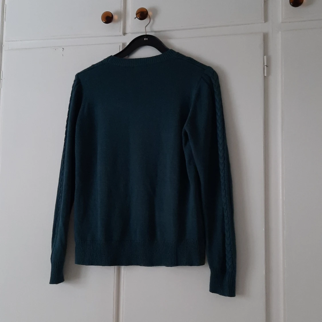 En mjuk, mörkgrön/blå långärmad som är stickad. Från Lindex, i storlek M. Den har två slits på sidorna nere på "mudden". Köpt på secondhand, men har aldrig använt den så den får säljas vidare. Pris: 40kr + frakt