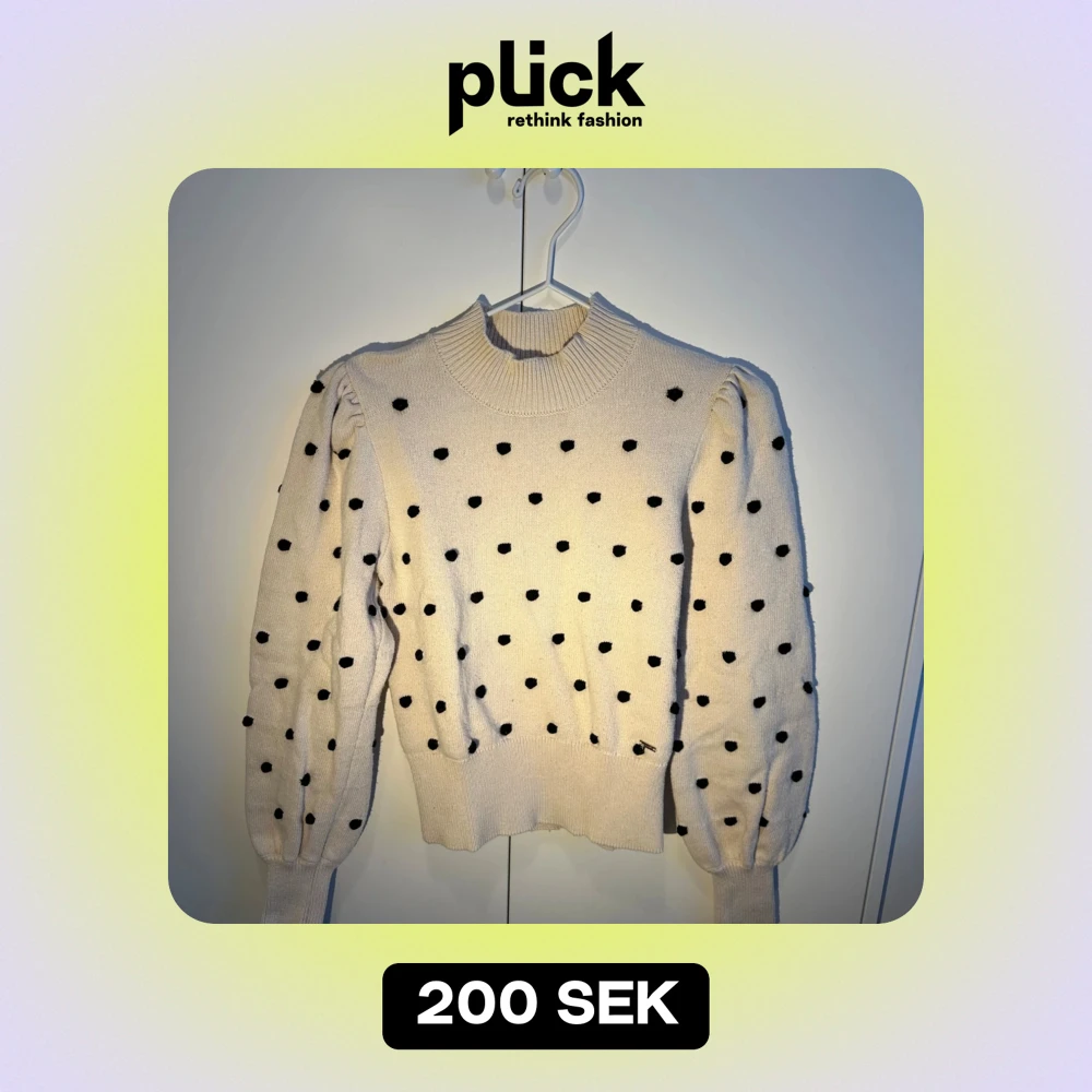 Superfin vit stickad tröja med svarta prickar över hela. Den har långa ärmar och en ribbad krage som ger en mysig känsla. Perfekt för höst och vinter, och den är i mycket bra skick. Passar både till vardags och lite finare tillfällen.💕🥰