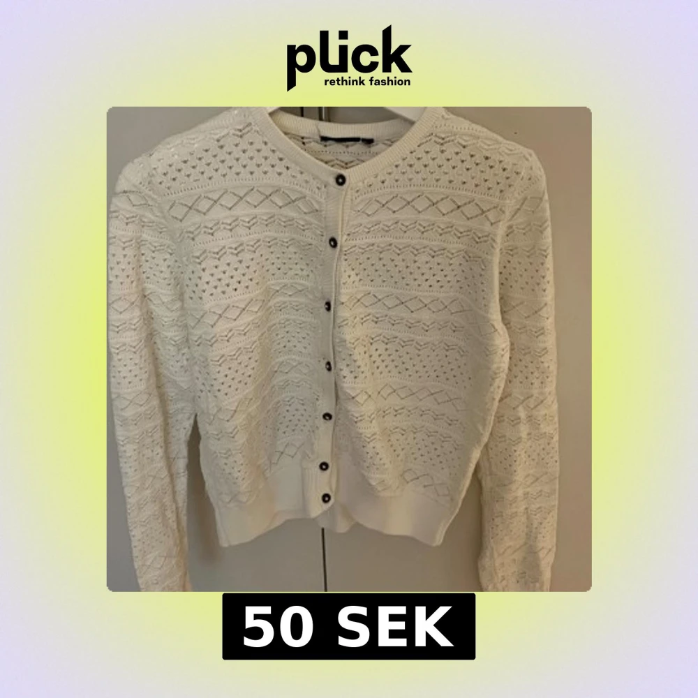Superfin vit stickad kofta med snyggt hålmönster och svarta knappar framtill. Koftan har rund halsringning, långa ärmar och ribbade muddar. Perfekt att slänga över en topp för en chill och stilren look.