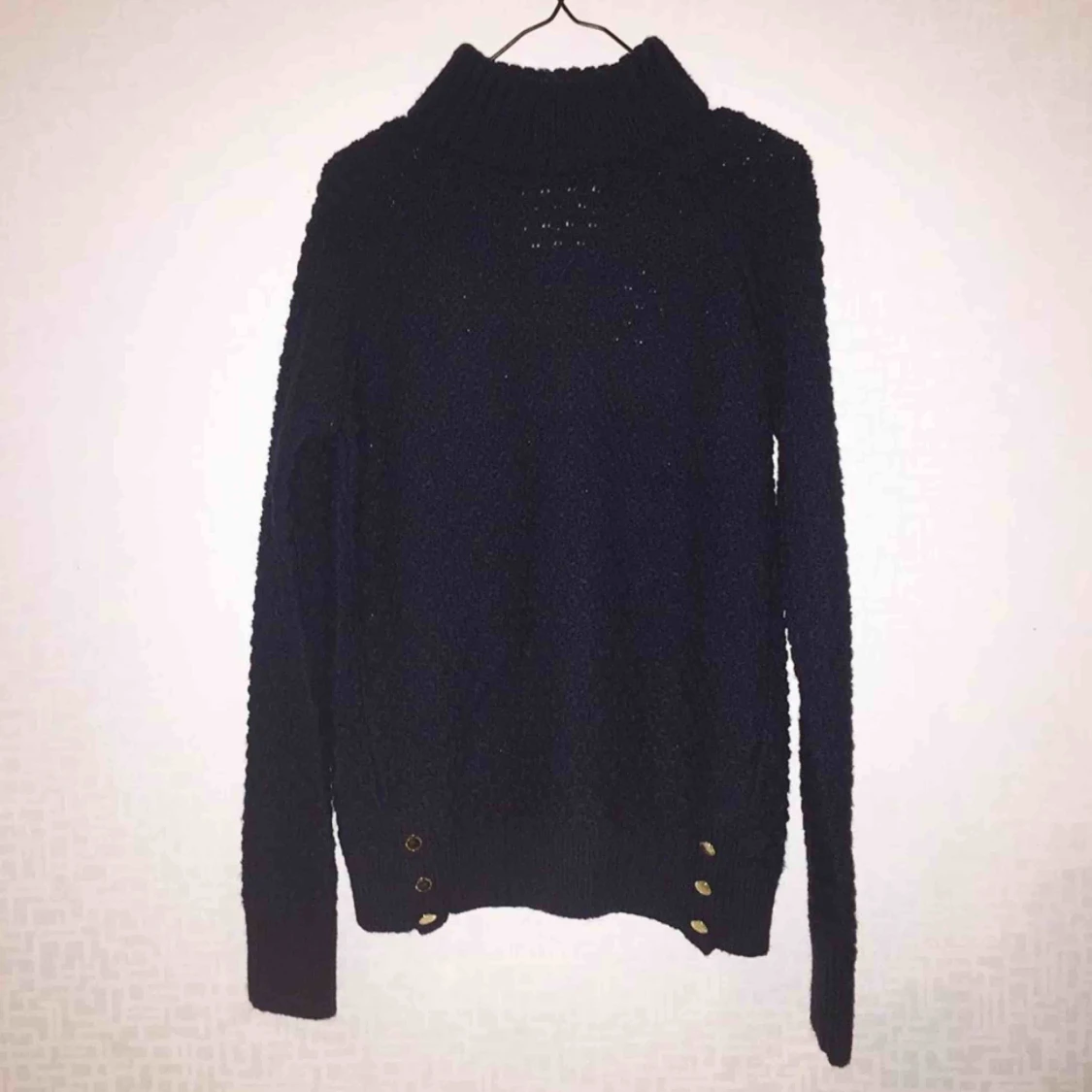 Mörkblå stickad tröja med gulddetaljer nedtill, storlek M men sitter bra på en person som normalt sett har storlek S! Använd någon enstaka gång så är i väldigt fint skick!