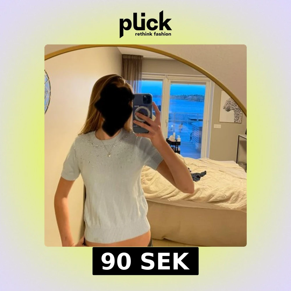 Supersöt ljusblå stickad T-shirt från Zara🩵 Tröjan har pärldetaljer upptill vid halsringningen. Några pärlor har tyvärr ramlat av men inget som märks!🥰 Tyvärr har den lite smink fläckar men bara på insidan så det syns inte när man har på sig den💞