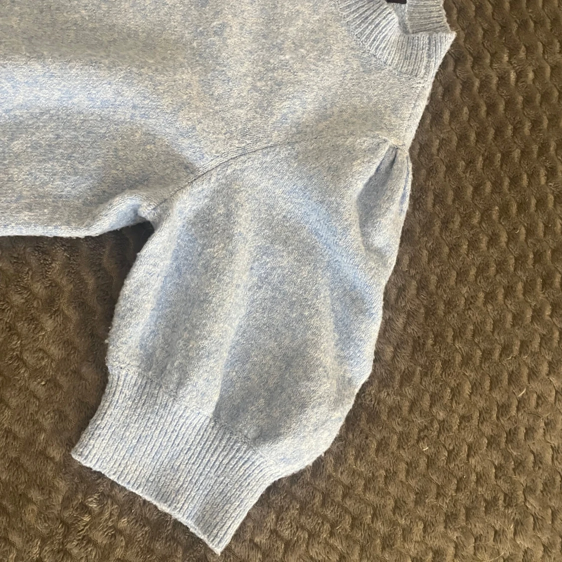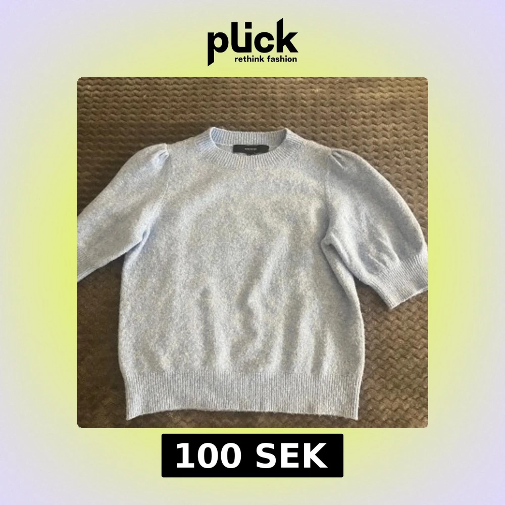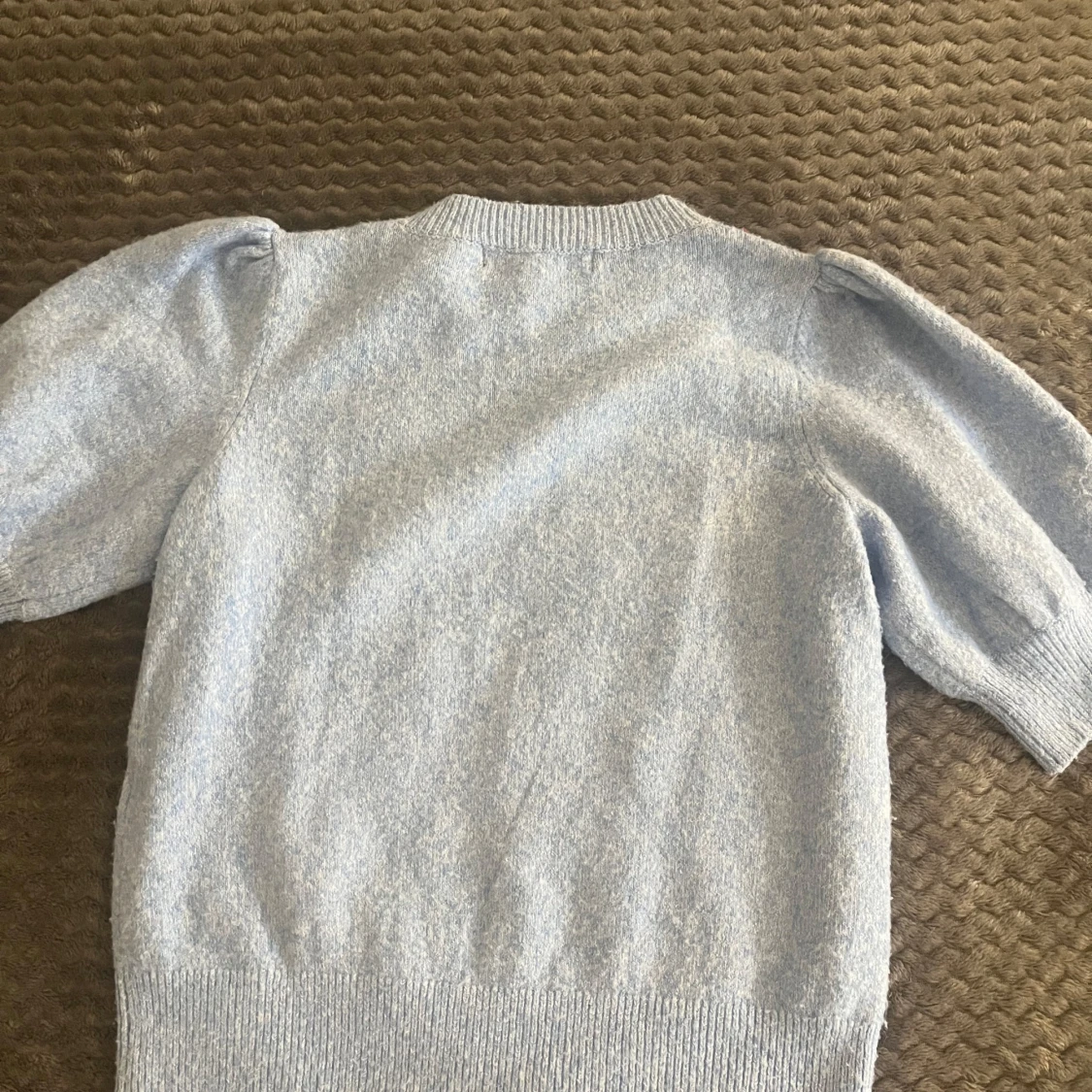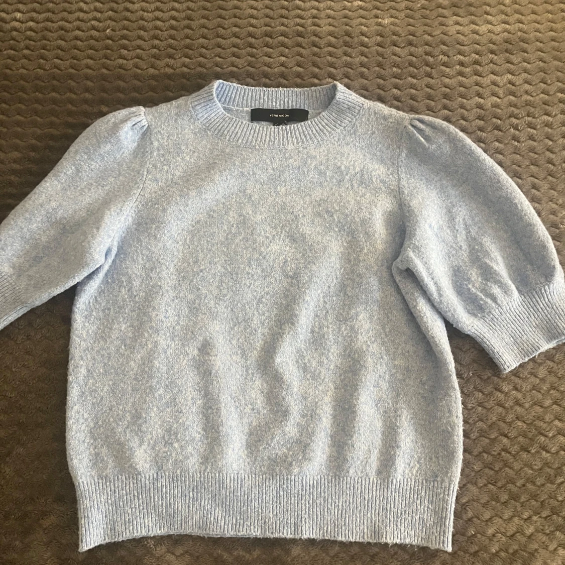 Superfin ljusblå stickad tröja från Vero Moda med puffärmar och ribbade muddar. Tröjan har korta armar. Snygg och enkel att matcha till olika outfits! Aldrig använd och inga fläckar eller hål!!❣️❣️❣️