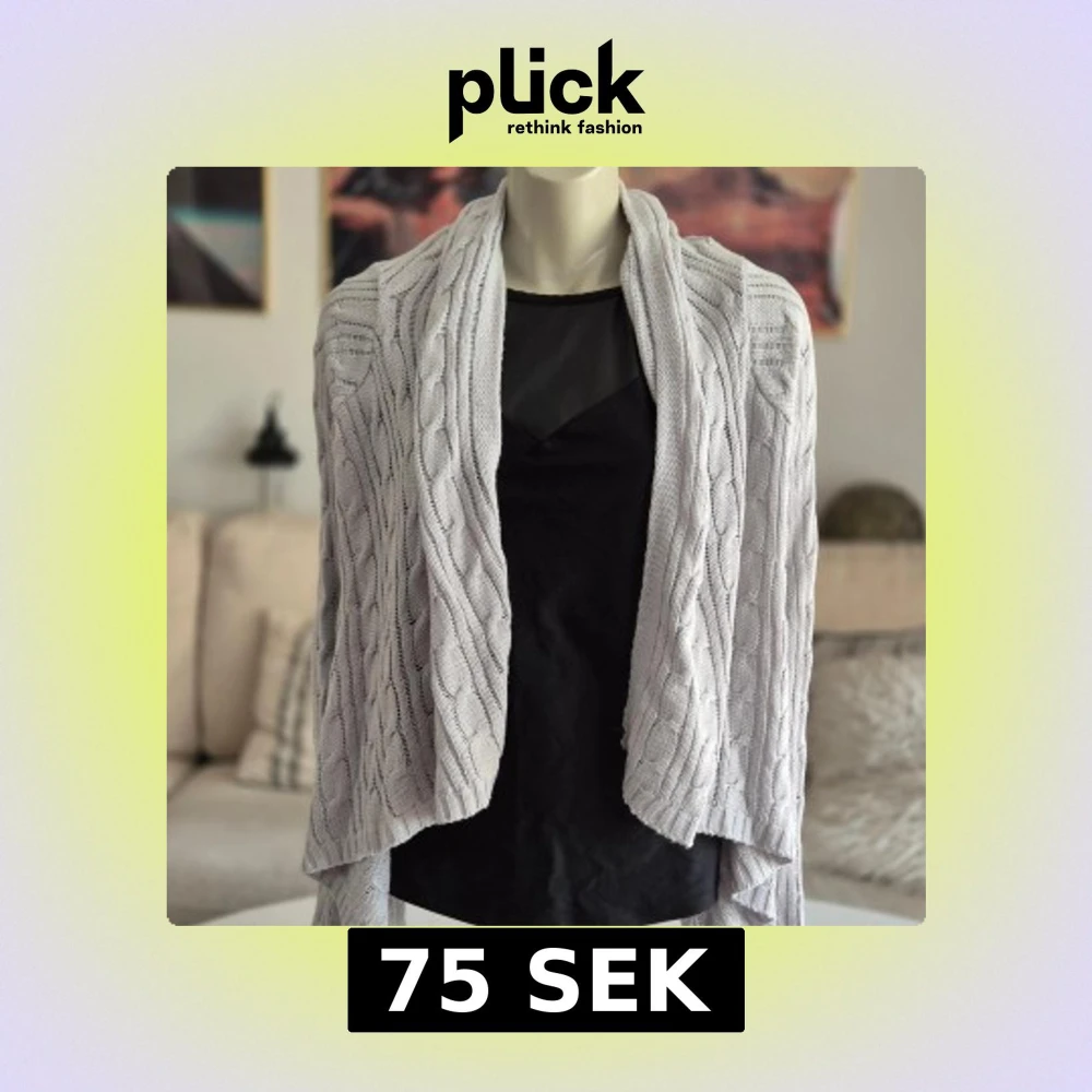 Ljusgrå stickad kofta med ett vackert flätat mönster. * Storlek M och sann i storleken. Sitter fint på en stl S som vill ha lite mer rymligt. * Öppen design utan knäppning. * Kortare bak än fram. * Superhärlig nu när kylan kommer. * Jättefint skick. Hittar inga fel. Djur och rökfritt hem. Se bilder och förstora då de ingår i beskrivningen. Se gärna mina övriga annonser. Vid avhämtning finns den i Sollentuna.
