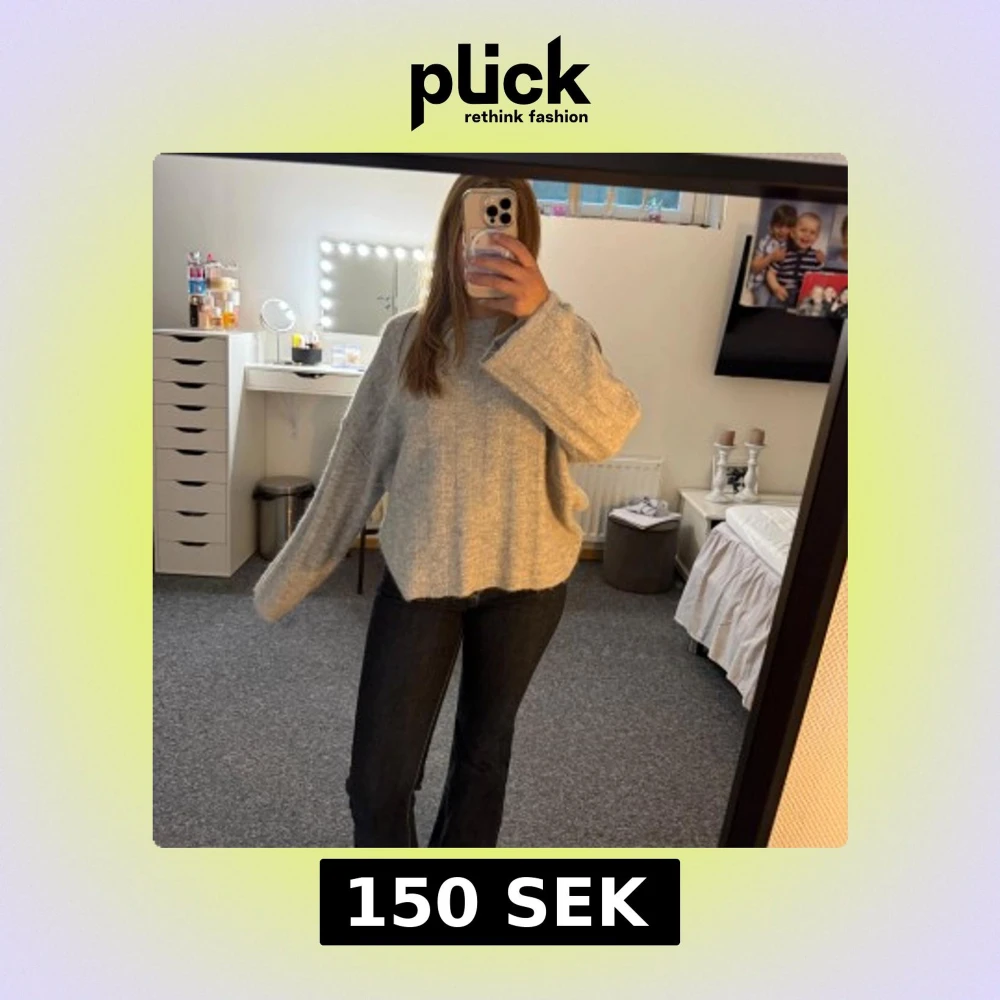 Mysig ljusgrå stickad tröja med breda ärmar och avslappnad oversized passform. Tröjan har en enkel rund halsringning och är tillverkad i ett mjukt, fluffigt material som känns riktigt skönt mot huden. Perfekt för kyliga dagar och enkel att styla.