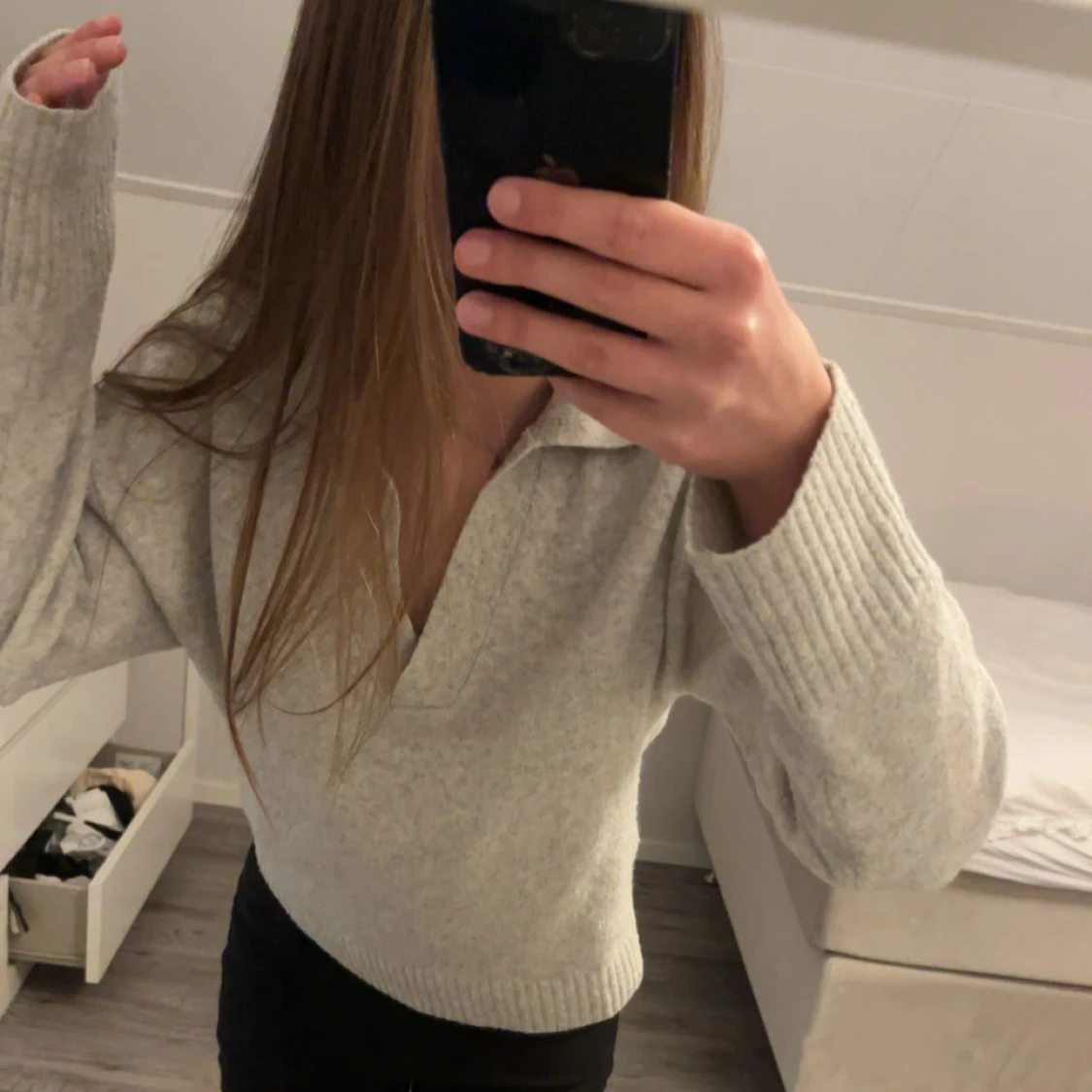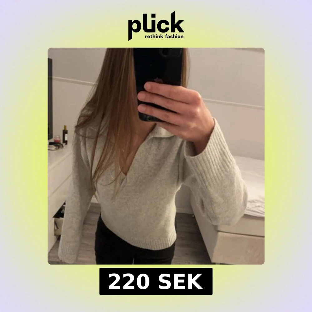 Säljer en ljusgrå stickad tröja med v-ringning och bred krage. Tröjan har långa ärmar med ribbade muddar. Säljer då jag inte får användning av den längre. Tröjan är i storlek XS men passar även S.