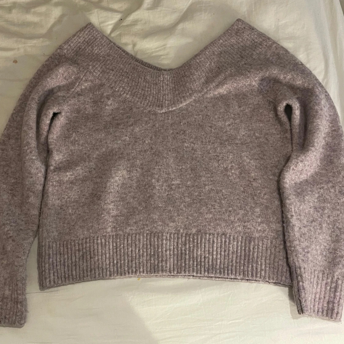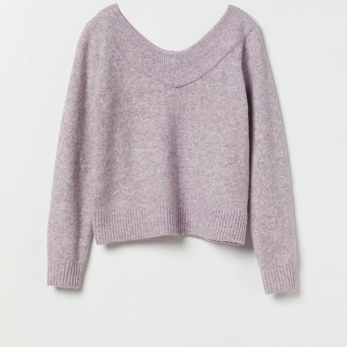 Mysig ljuslila stickad tröja från H&M med en bred ribbad kant vid halsen och ärmsluten. Perfekt för kyliga dagar med sin mjuka och bekväma passform. Tröjan har långa ärmar och en något lös passform. Priset kan diskuteras.