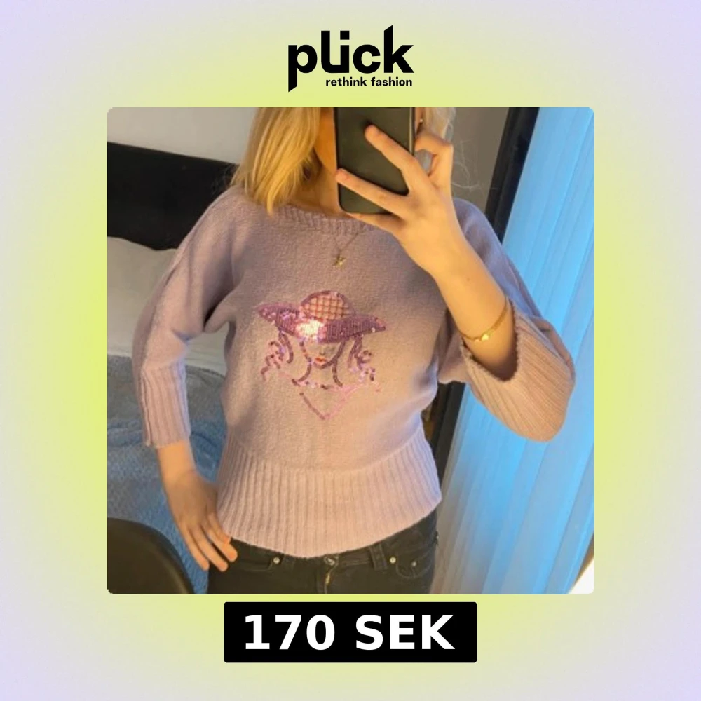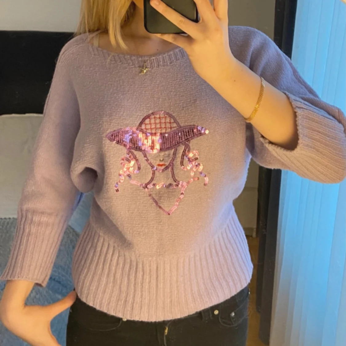 Superfin ljuslila stickad tröja med ett glittrigt paljettmotiv av en tjej med hatt på bröstet. Tröjan har ribbad nederkant och muddar, samt långärmad och loose passform. Perfekt för dig som gillar unika detaljer och pastellfärger. Storleken är ej angiven men skulle gissa på S/M.