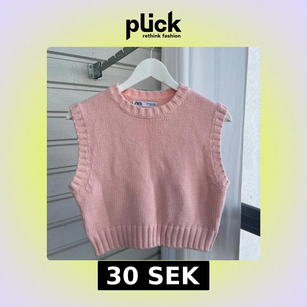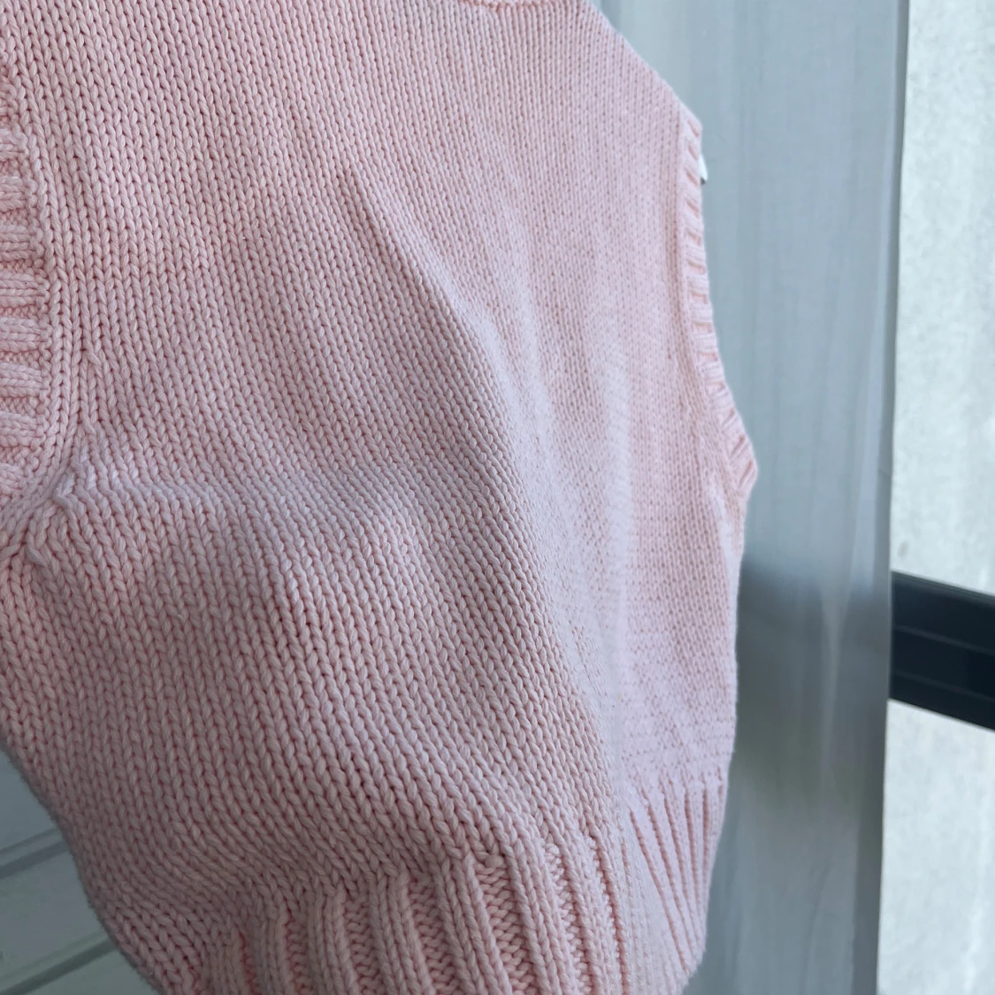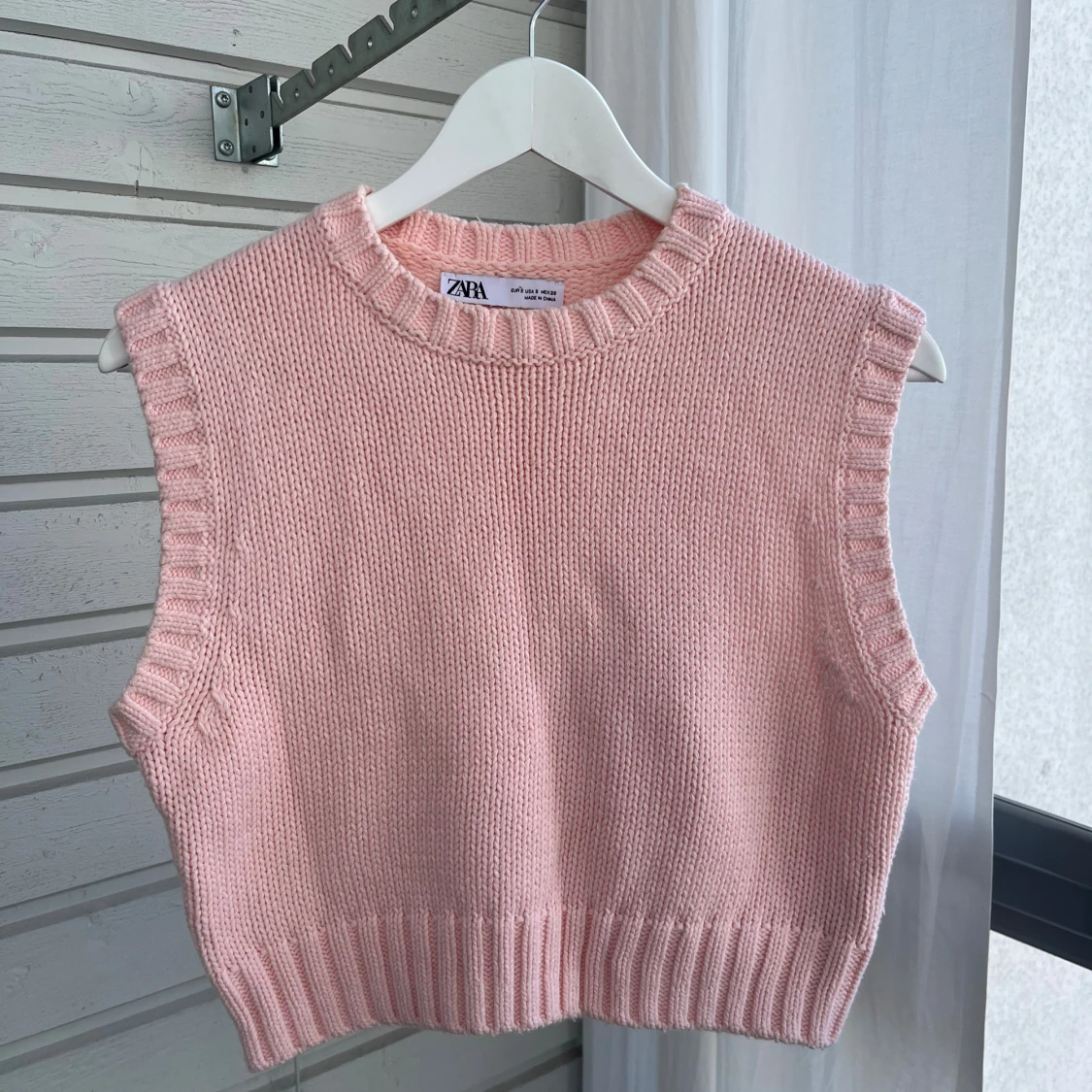 Superfin ljusrosa stickad väst från Zara med bred ribbad kant vid hals, ärm och nederkant. Västen är croppad och har en klassisk, enkel design som är lätt att styla över en skjorta eller t-shirt. Perfekt för lager-på-lager-look!